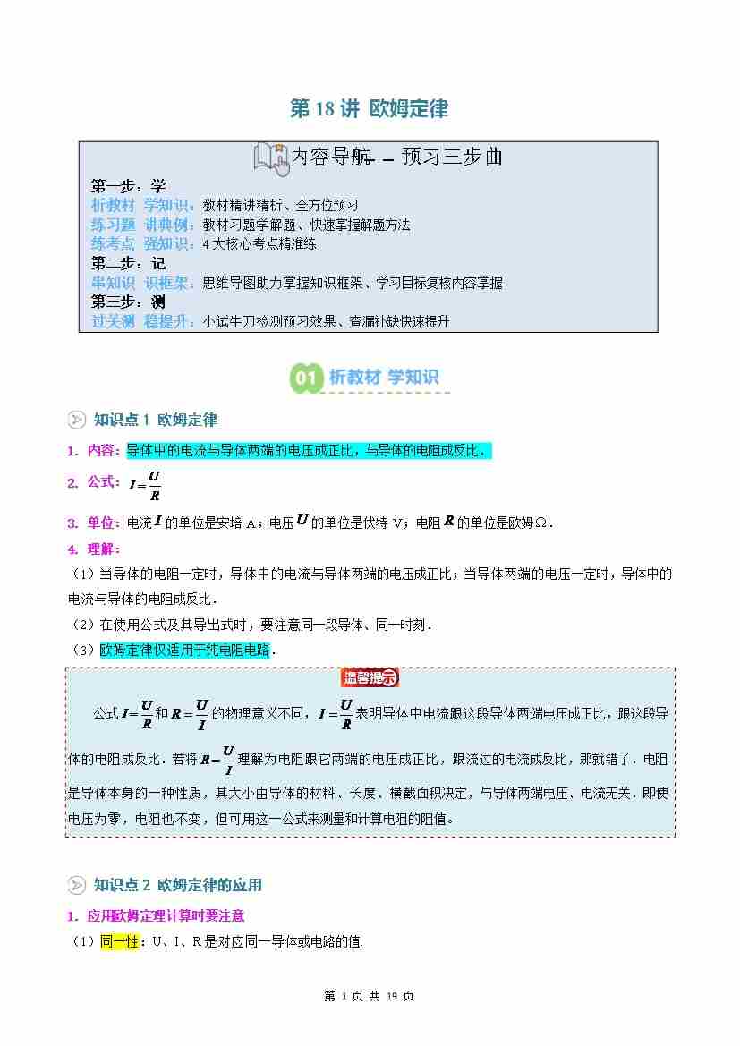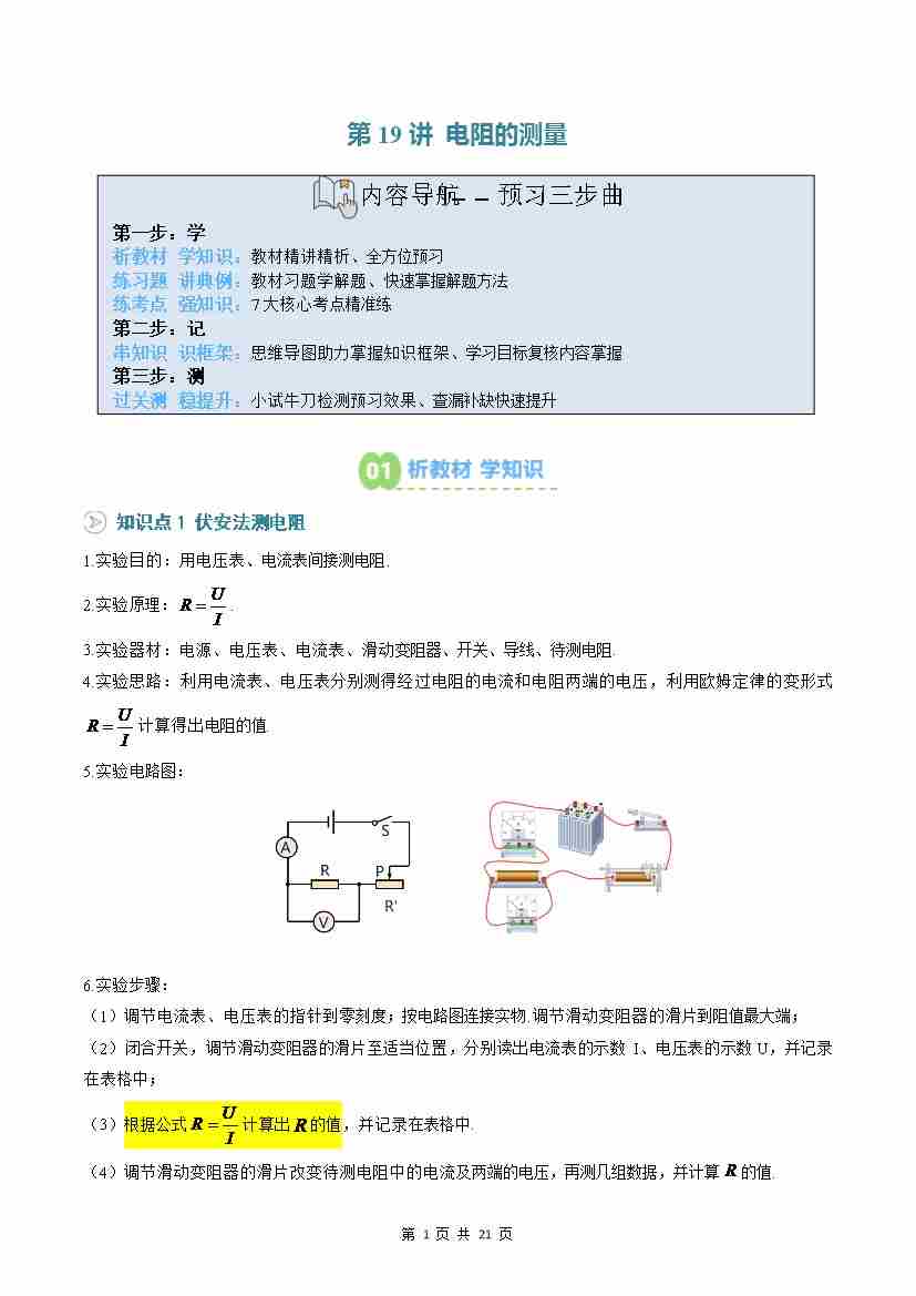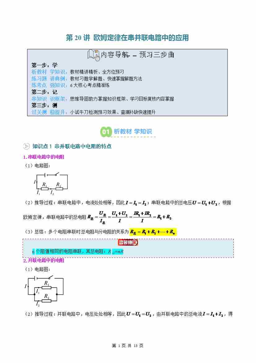 第20讲: 欧姆定律在串并联电路中的应用(预习)(原卷版)