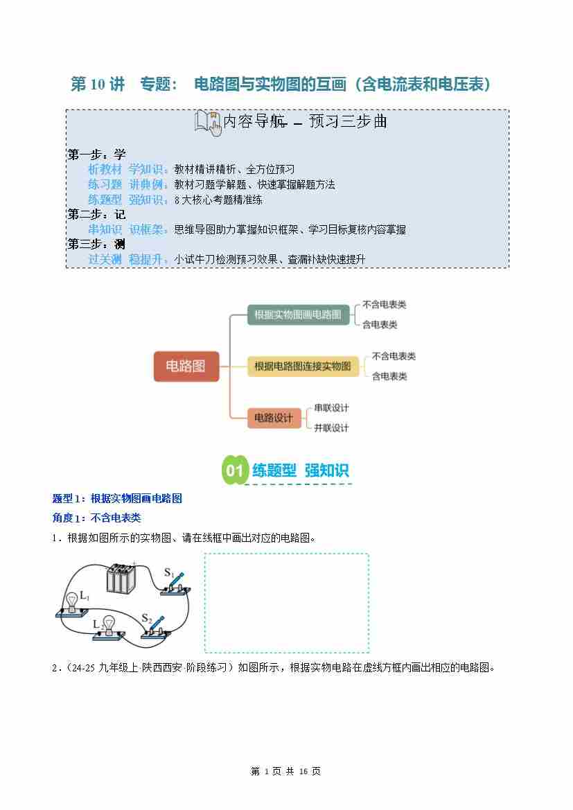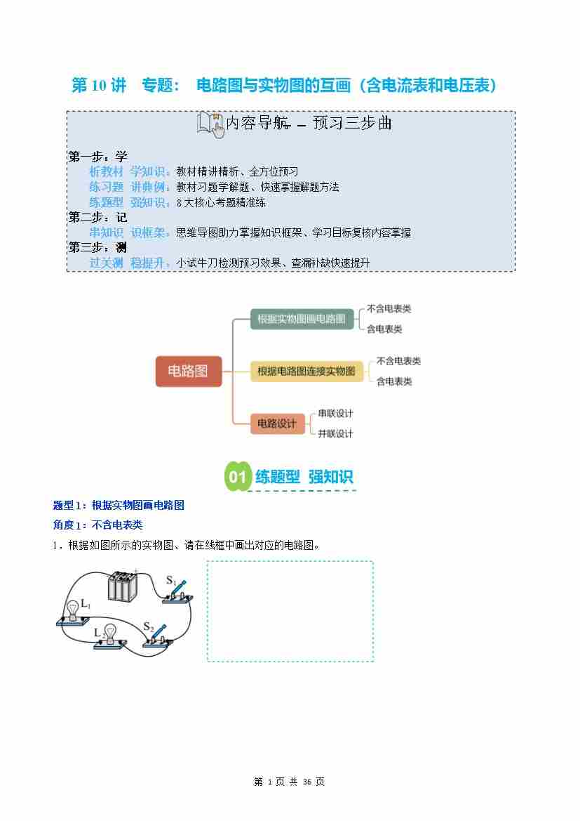 第10讲: 专题:电路图与实物图的互画(预习)(原卷版)