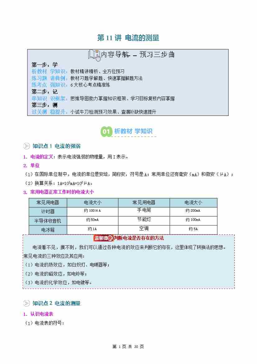 第11讲: 电流的测量(预习)(原卷版)