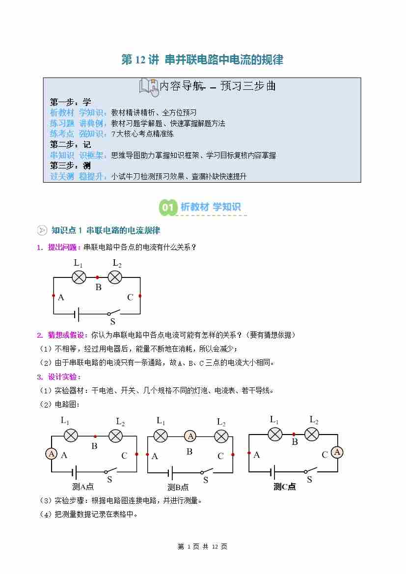 第12讲: 串并联电路中电流的规律(预习)(原卷版)