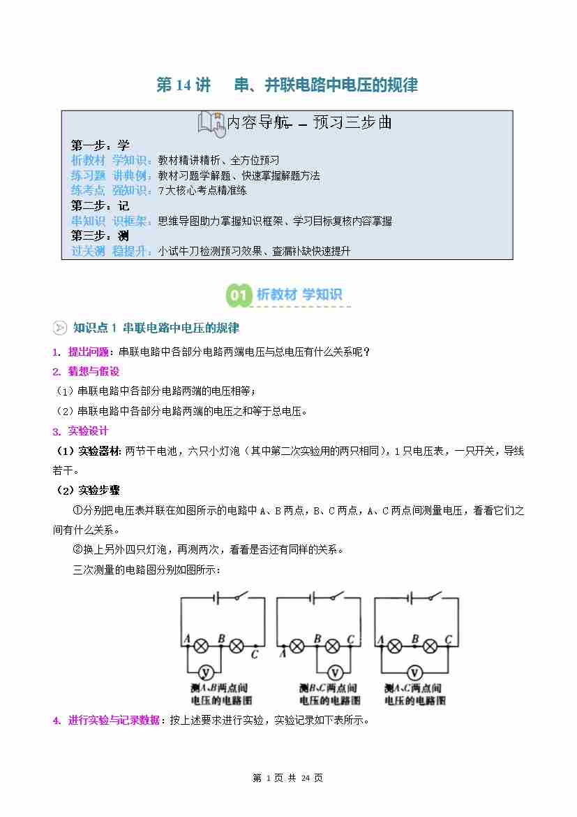 第14讲: 串、并联电路中电压的规律(原卷版)