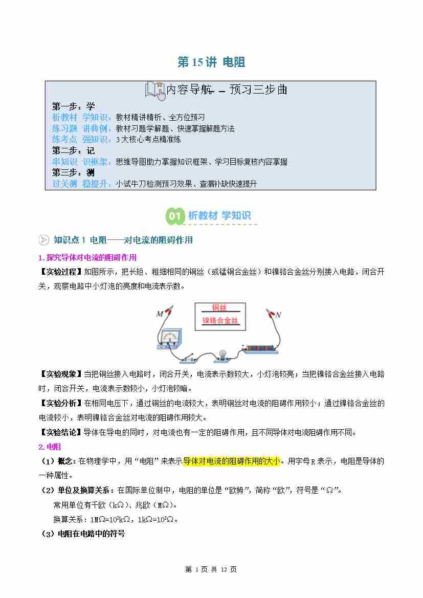 第15讲: 电阻(预习)(原卷版)
