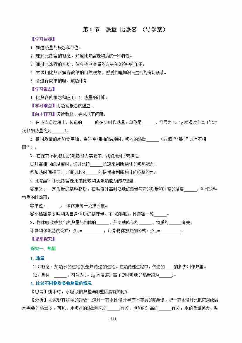 第1节 热量 比热容 (导学案)(原卷版)