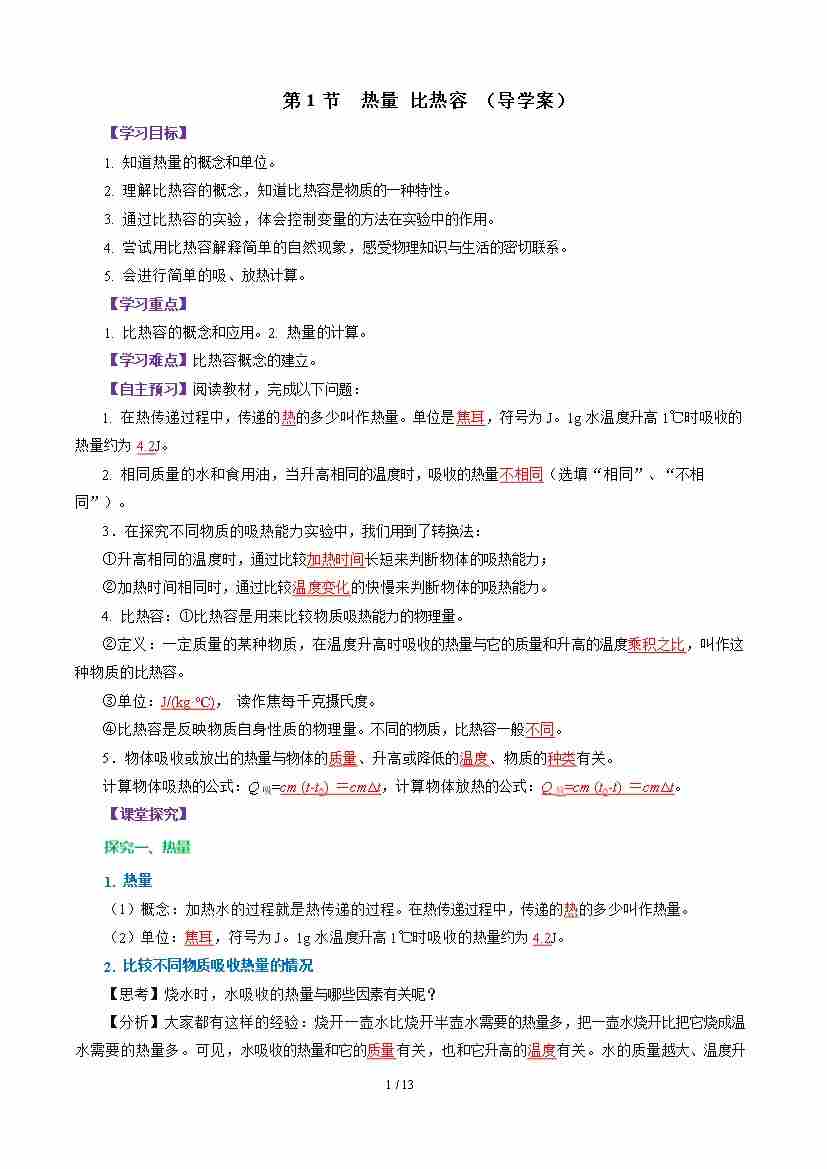 第1节 热量 比热容 (导学案)(解析版)