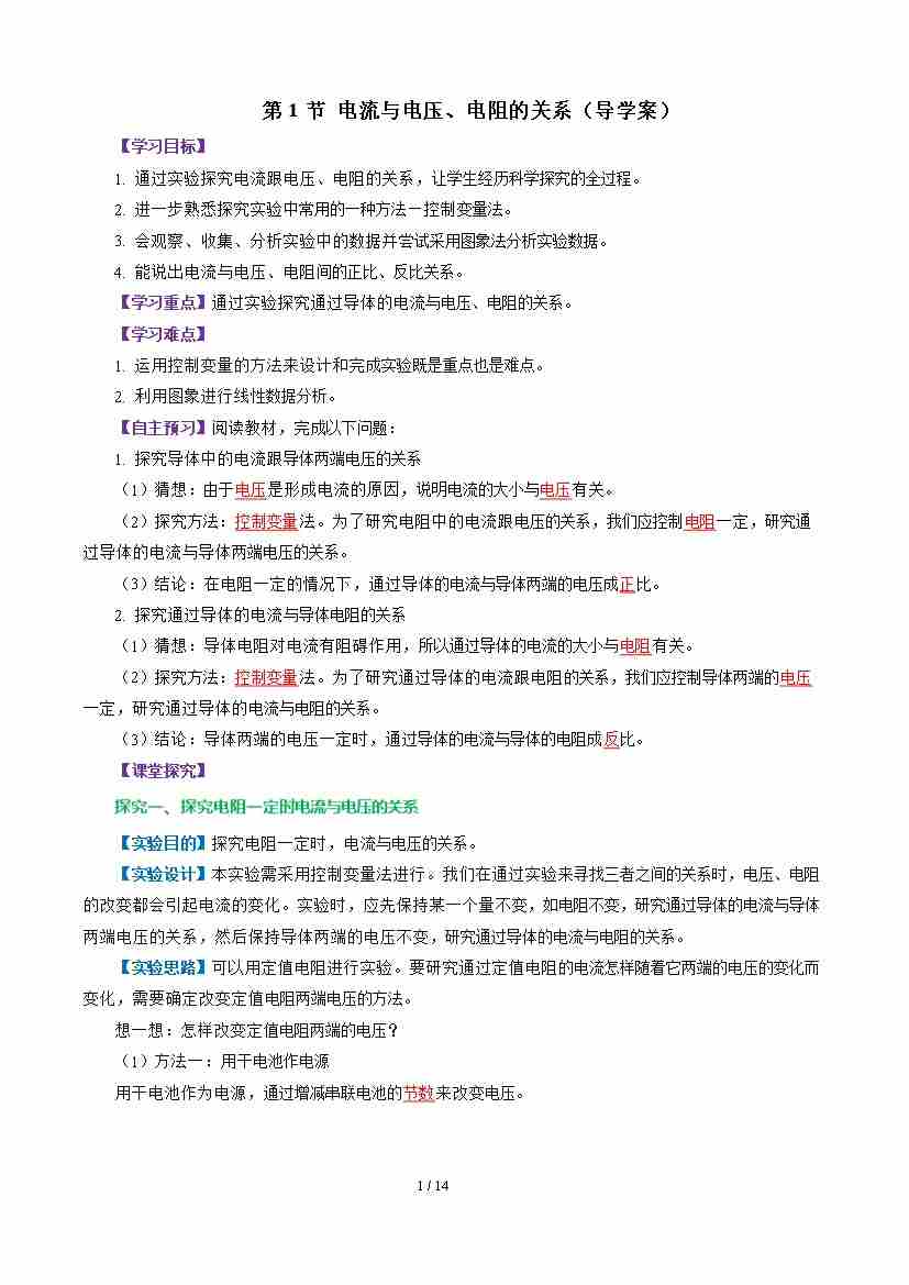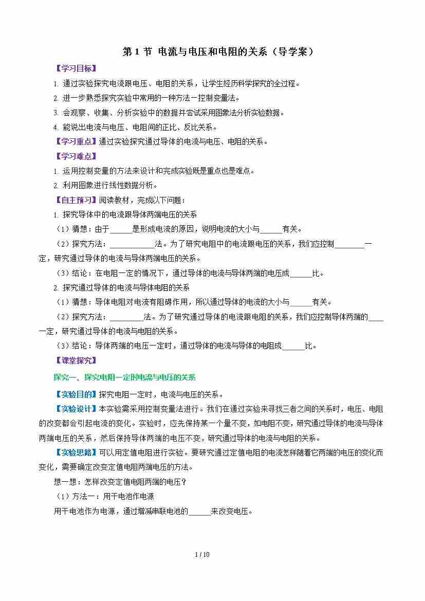 第1节 电流与电压、电阻的关系(导学案)(原卷版)