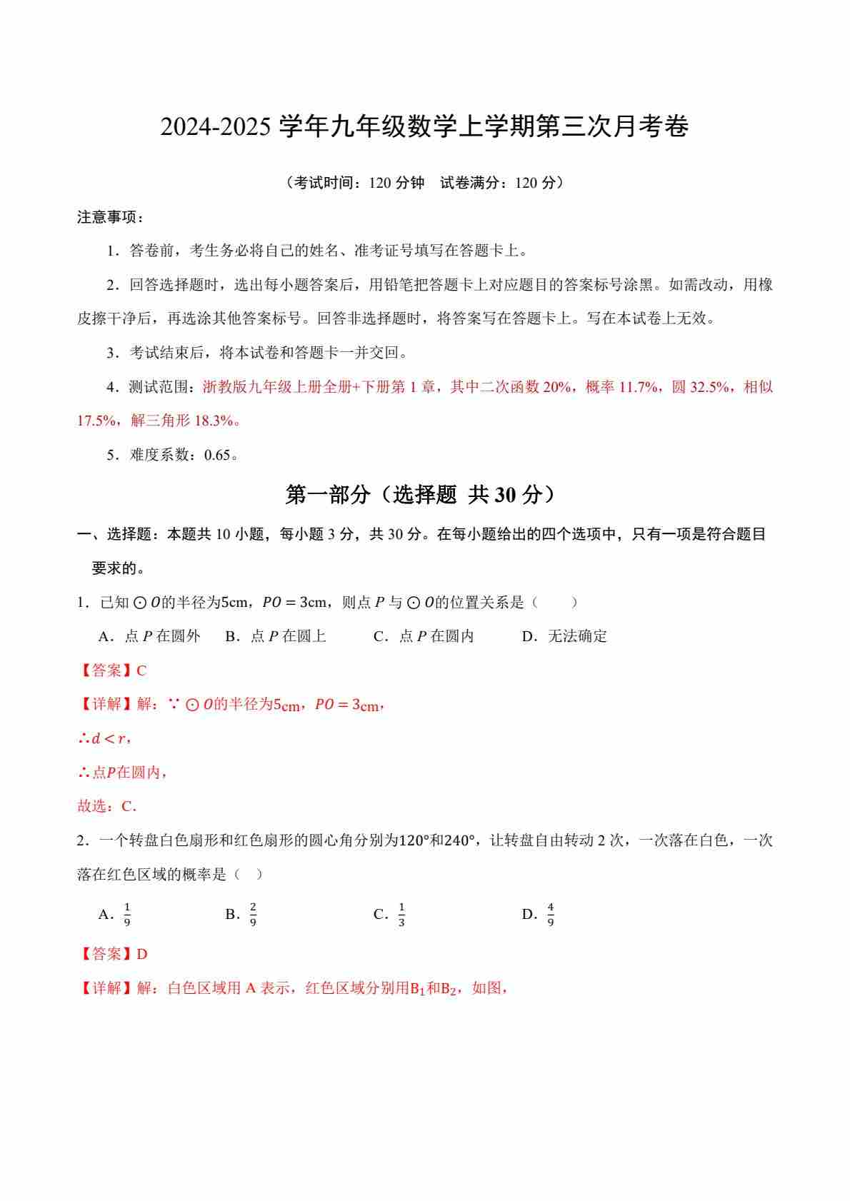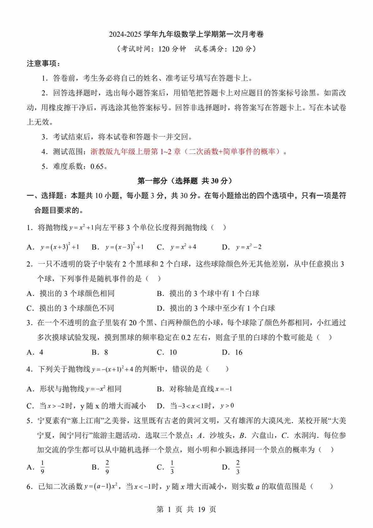 【浙教】9上数学第1次月考【第1-2章】2024