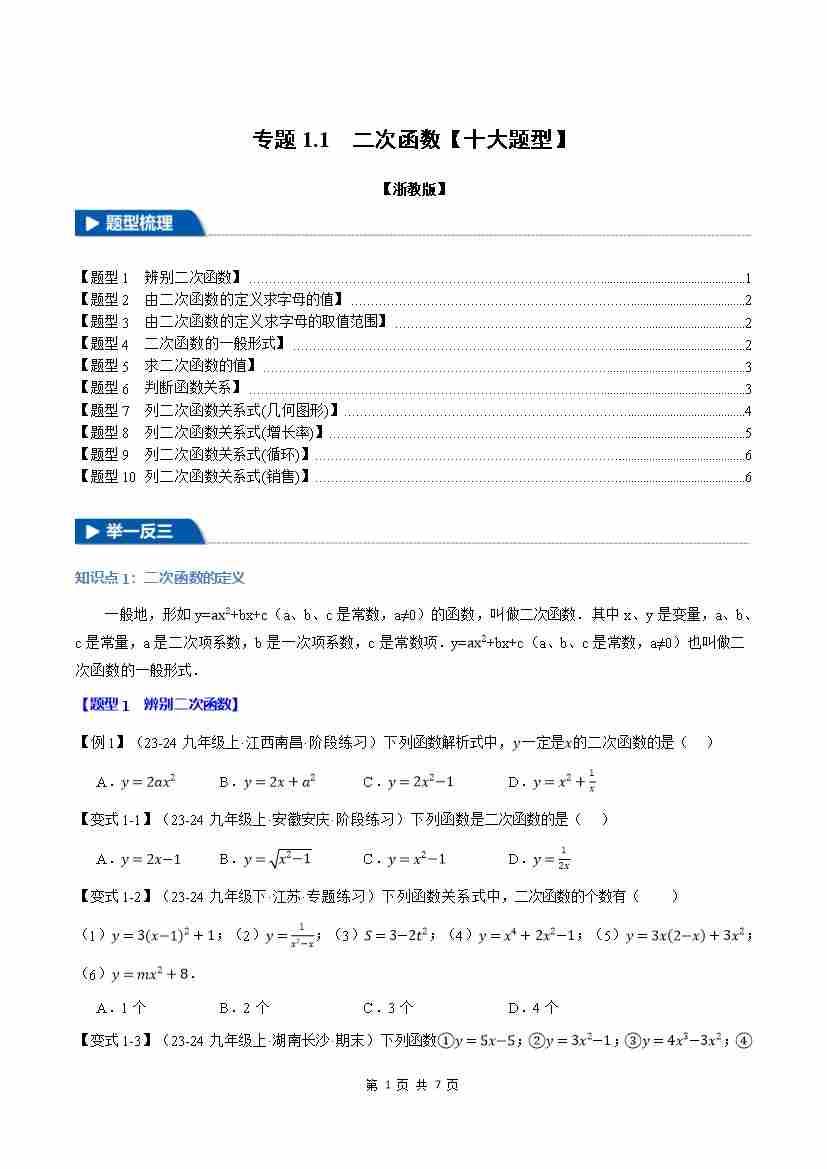 专题1.1 二次函数【十大题型】(举一反三)(浙教版)(原卷版)