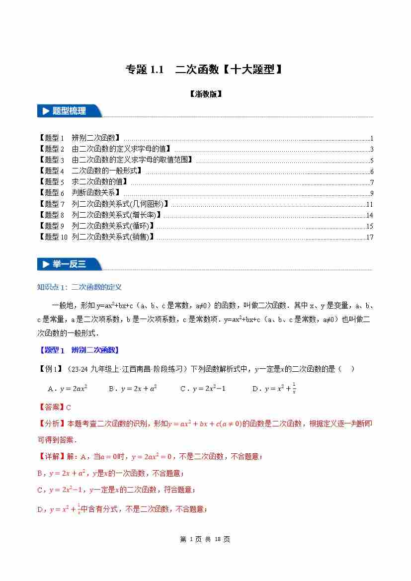 专题1.1 二次函数【十大题型】(举一反三)(浙教版)(解析版)