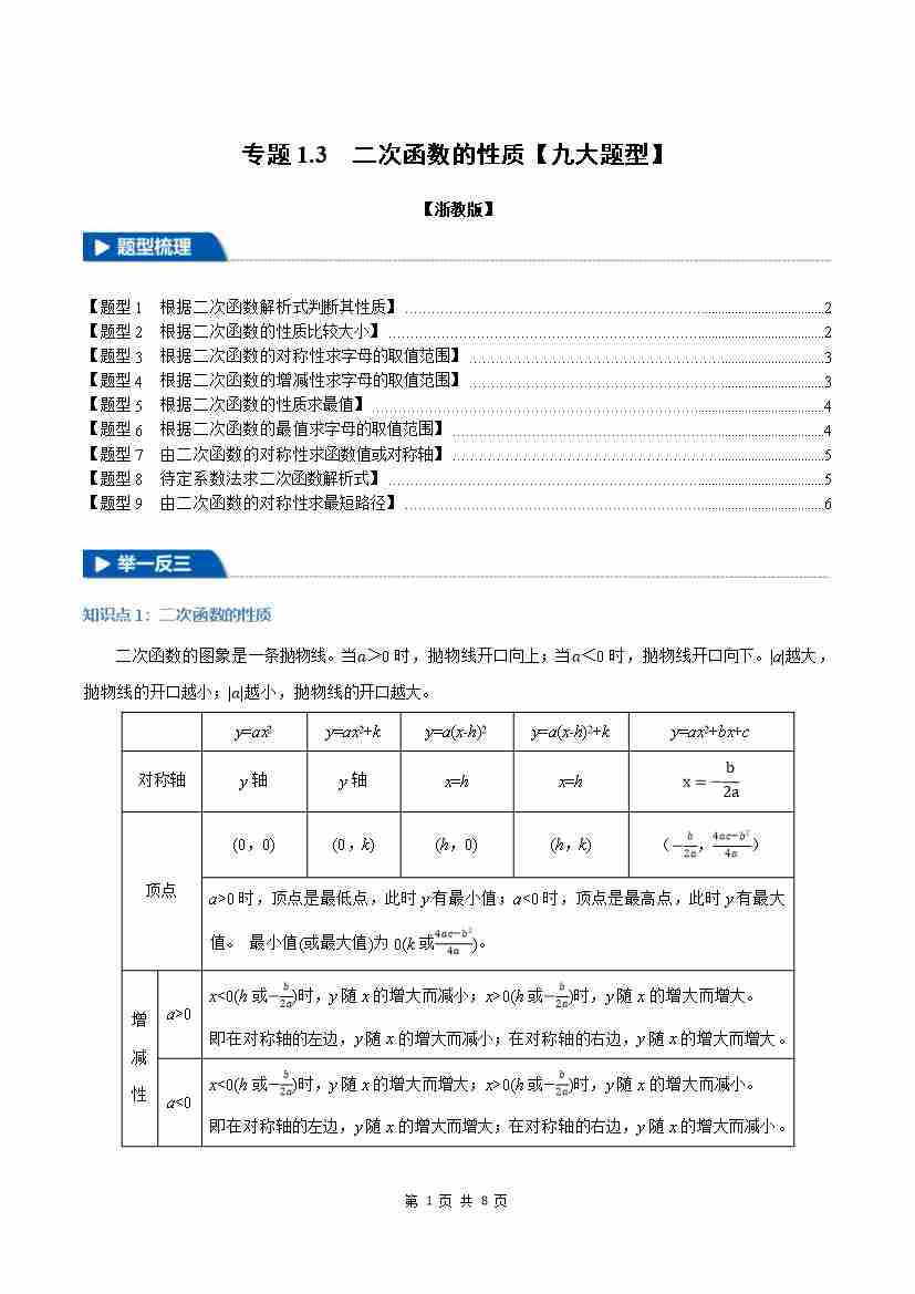 专题1.3 二次函数的性质【九大题型】(举一反三)(浙教版)(原卷版)