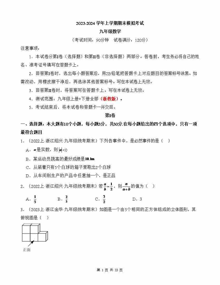 【浙教】9上数学期末卷【9上全册+9下1-2章】