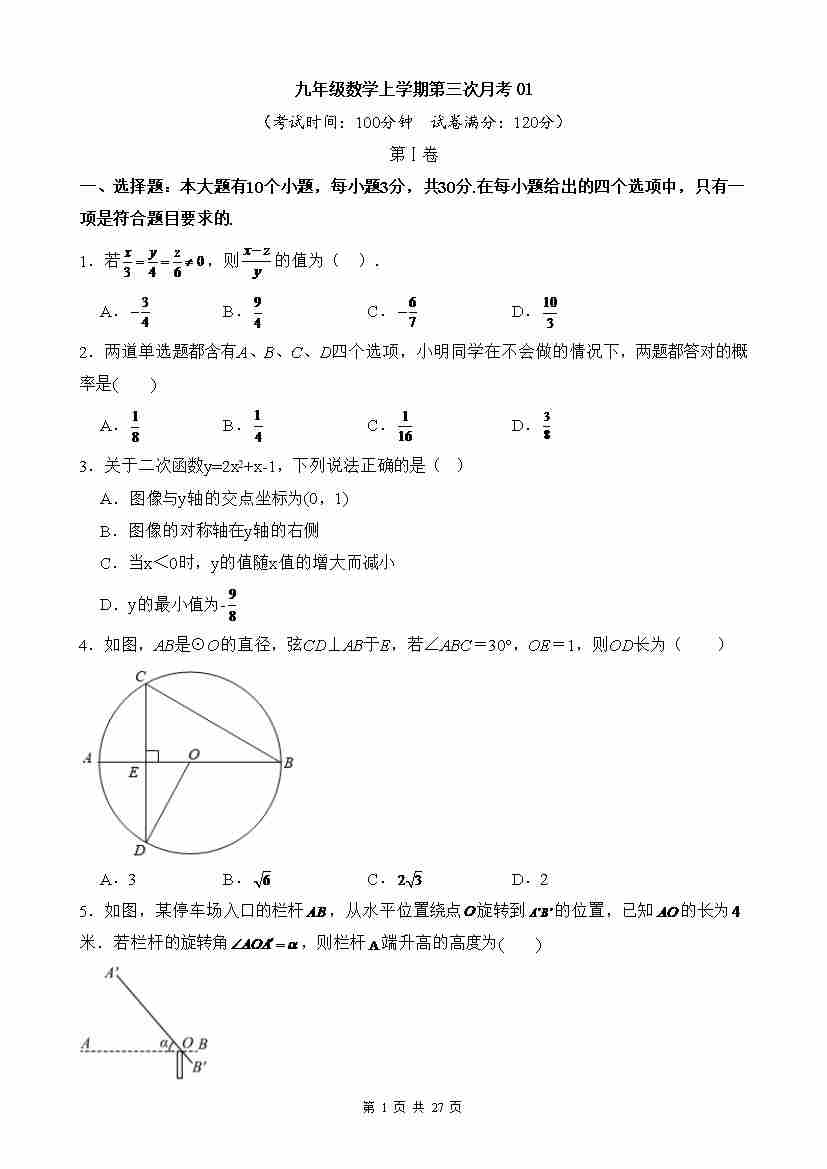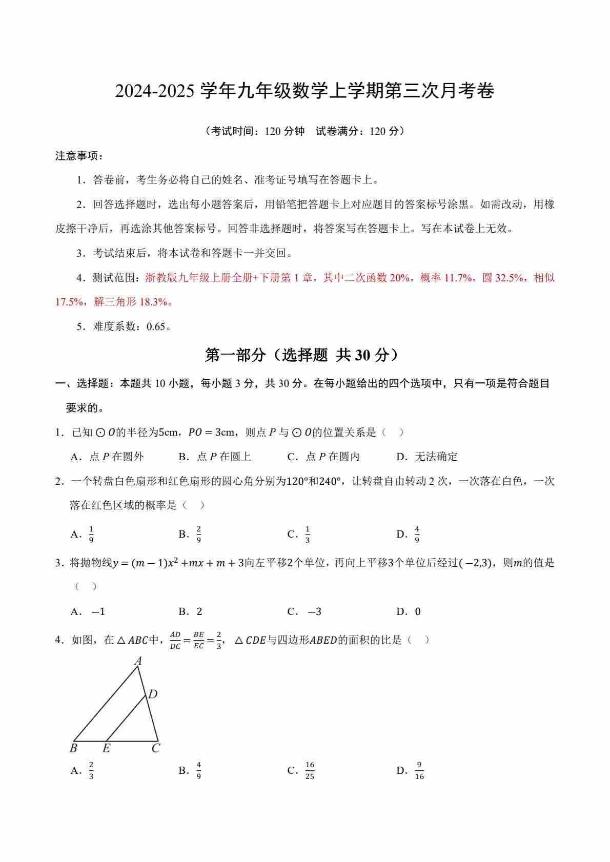九上数学:【浙教】第三次月考卷【范围:九上全册、下册第1章】