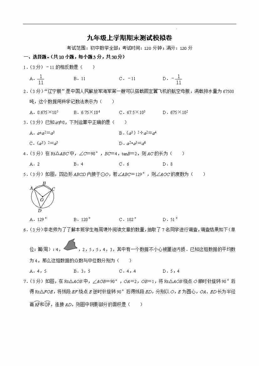 九年级上学期期末测试模拟卷(原卷版)