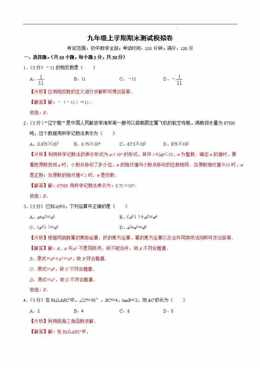 九年级上学期期末测试模拟卷(解析版)
