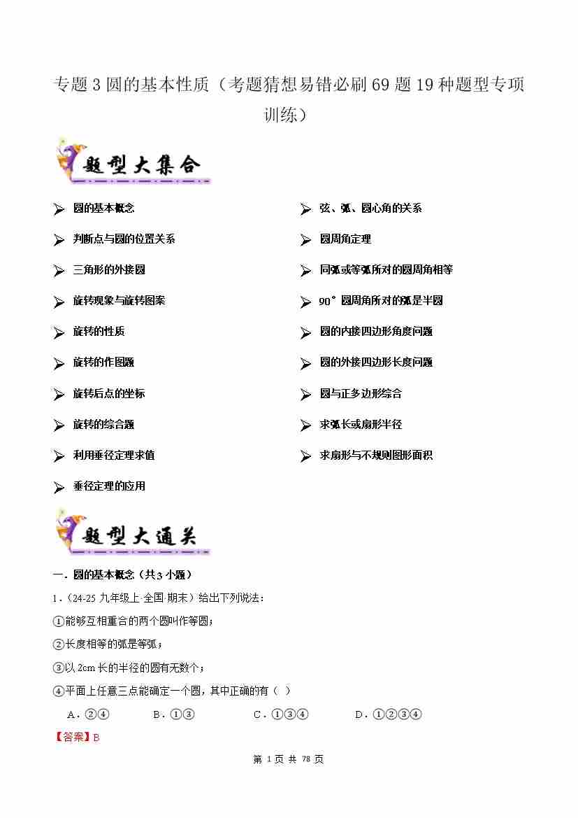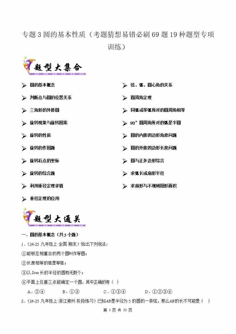 专题03圆的基本性质(考题猜想,易错必刷69题19种题型)(原题版)