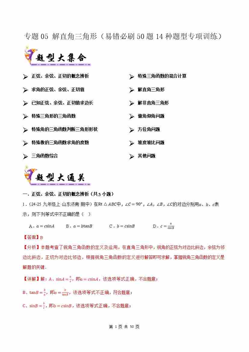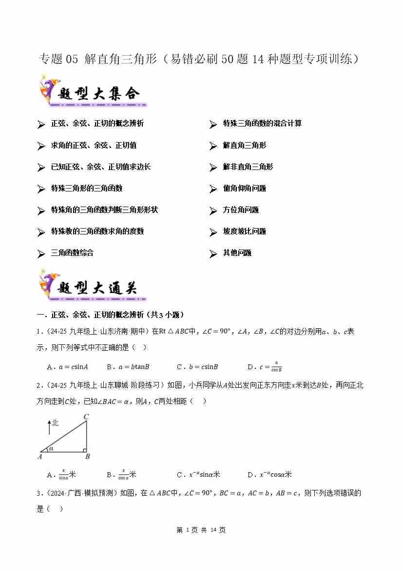 专题05解直角三角形(考题猜想,易错必刷50题14种题型)(原题版)