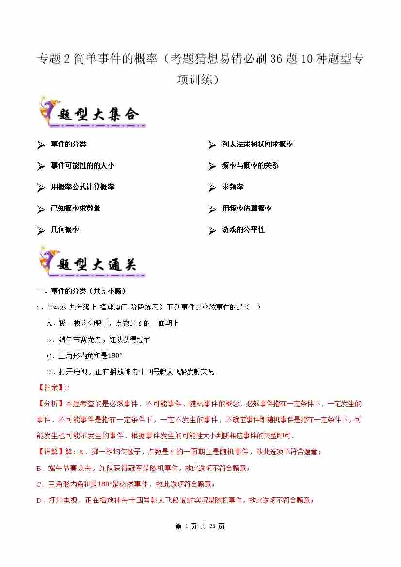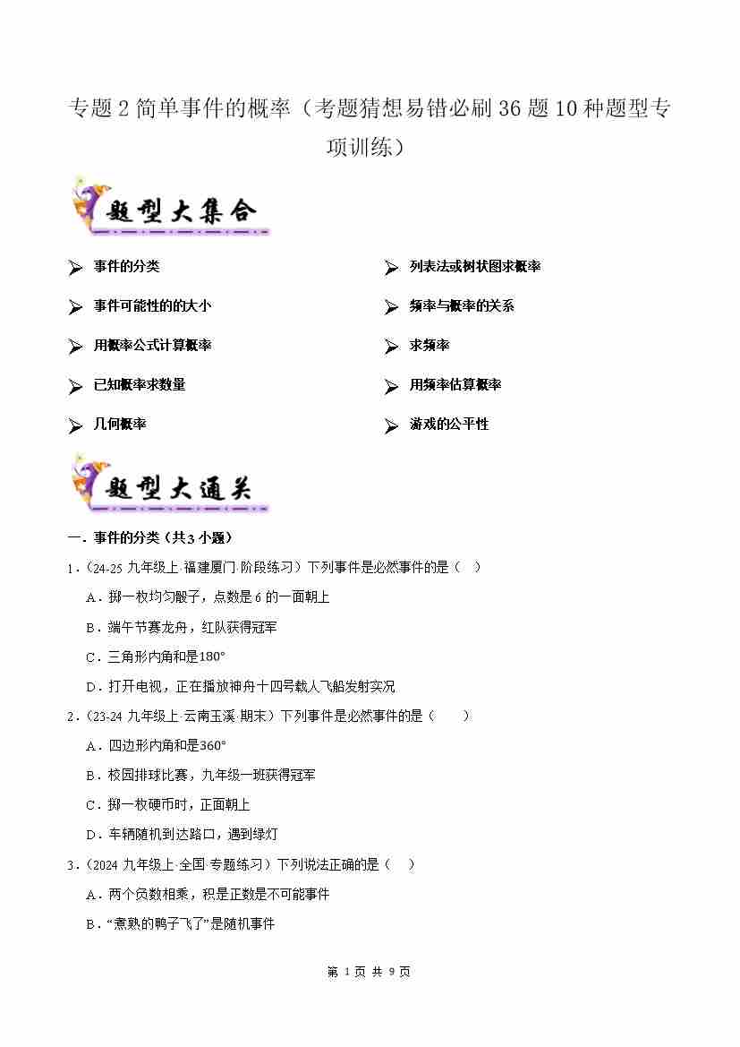 专题2简单事件的概率(考题猜想,易错必刷36题10种题型)(原题版)
