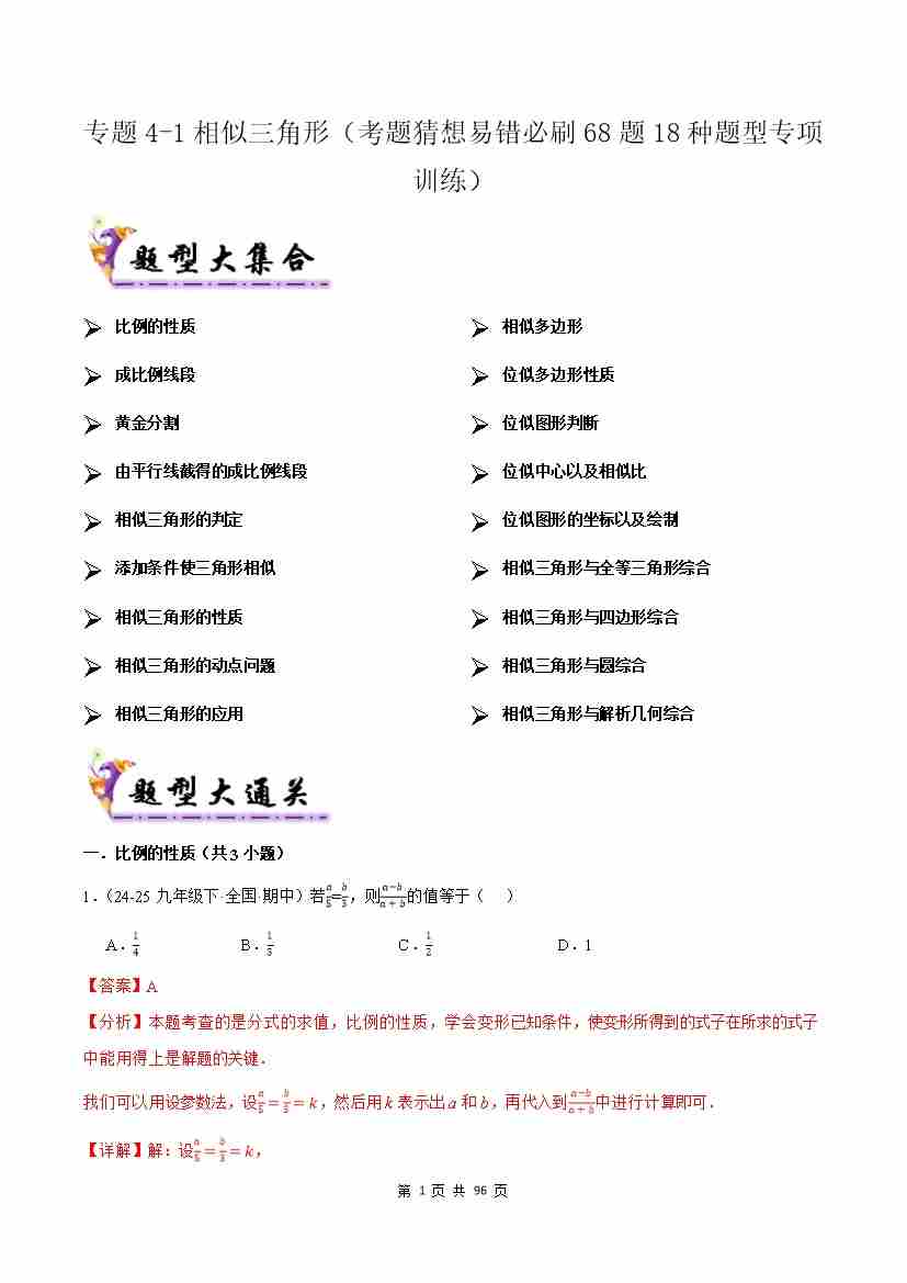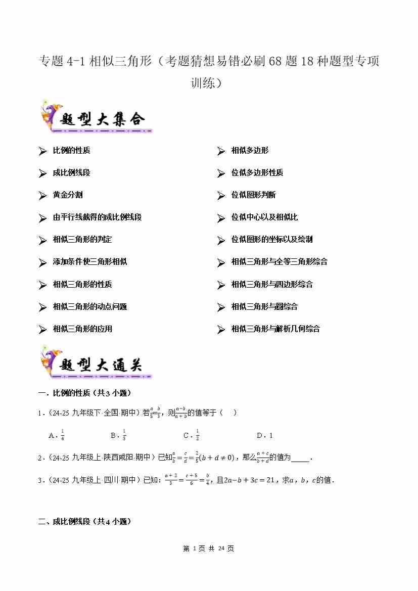 专题4-1相似三角形(考题猜想,易错必刷68题18种题型)(原题版)