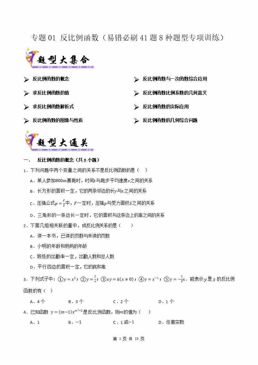 专题01 反比例函数(考题猜想,易错必刷34题14种题型)(原卷版)