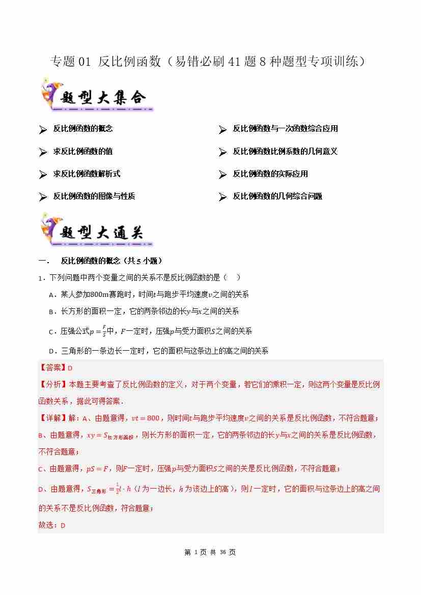 专题01 反比例函数(考题猜想,易错必刷34题14种题型)(解析版)