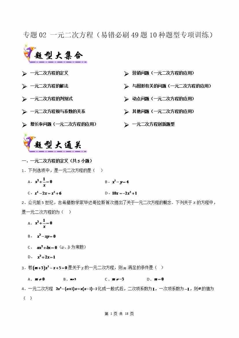 专题02 一元二次方程(考题猜想,易错必刷49题10种题型专项训练)(原卷版)