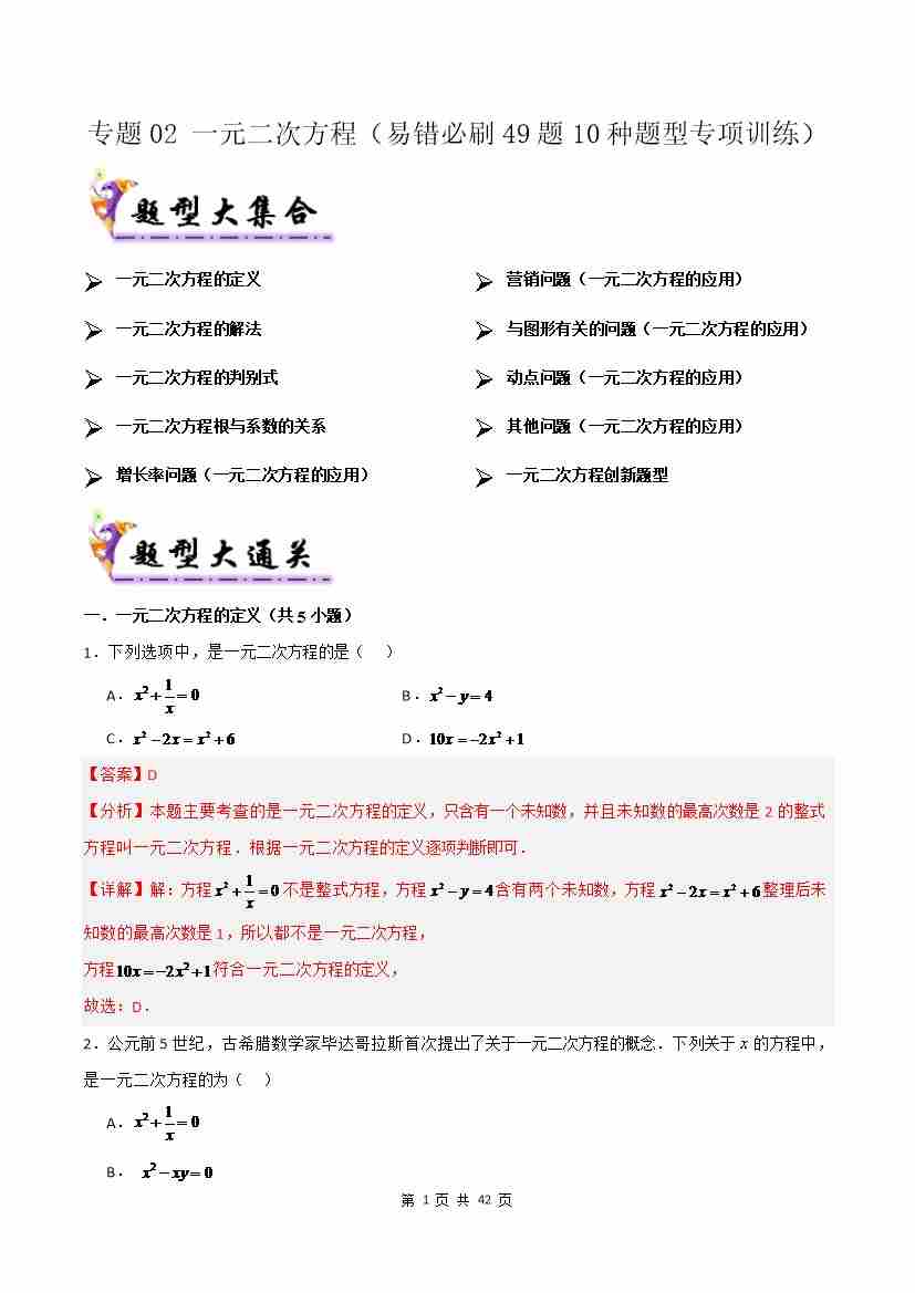 专题02 一元二次方程(考题猜想,易错必刷49题10种题型专项训练)(解析版)