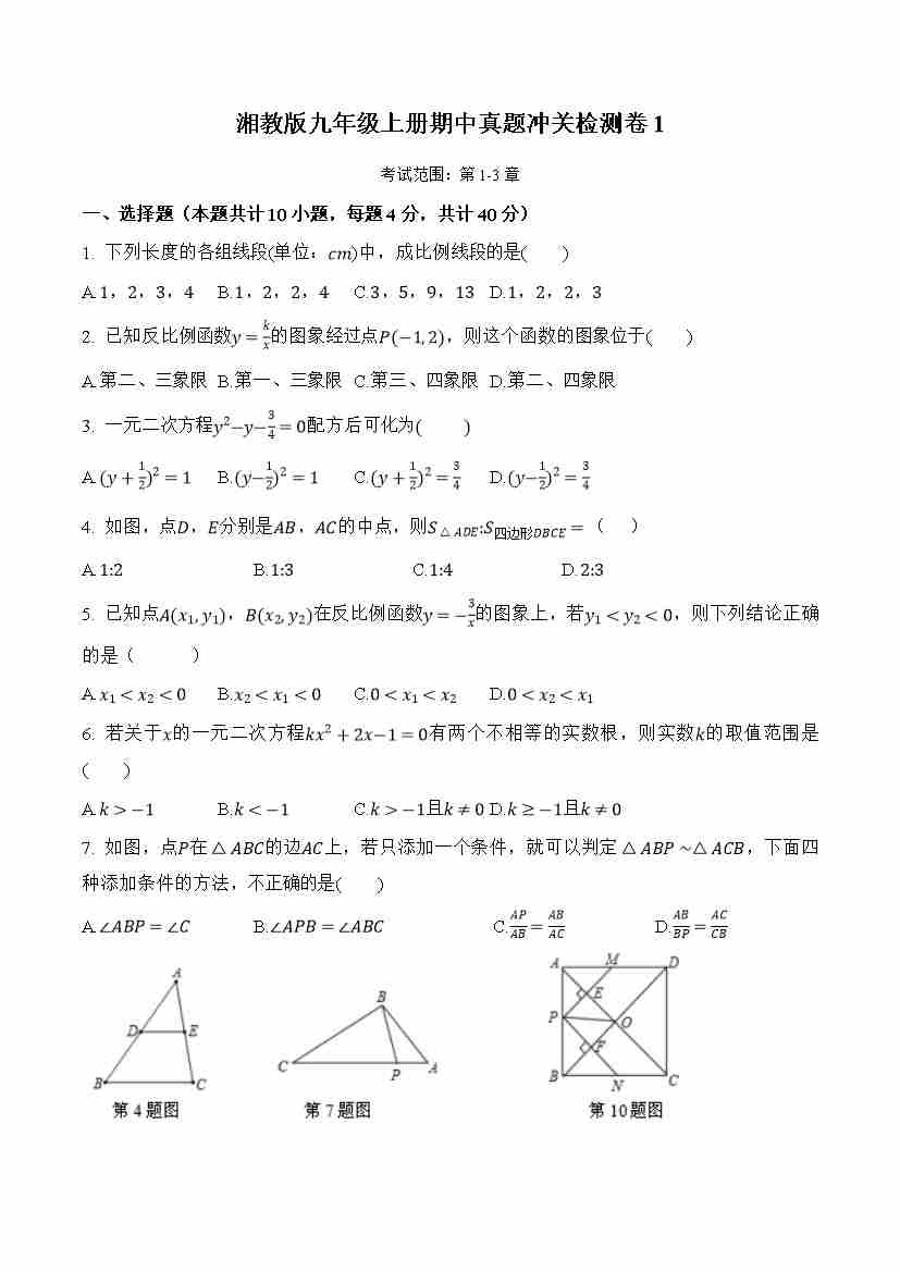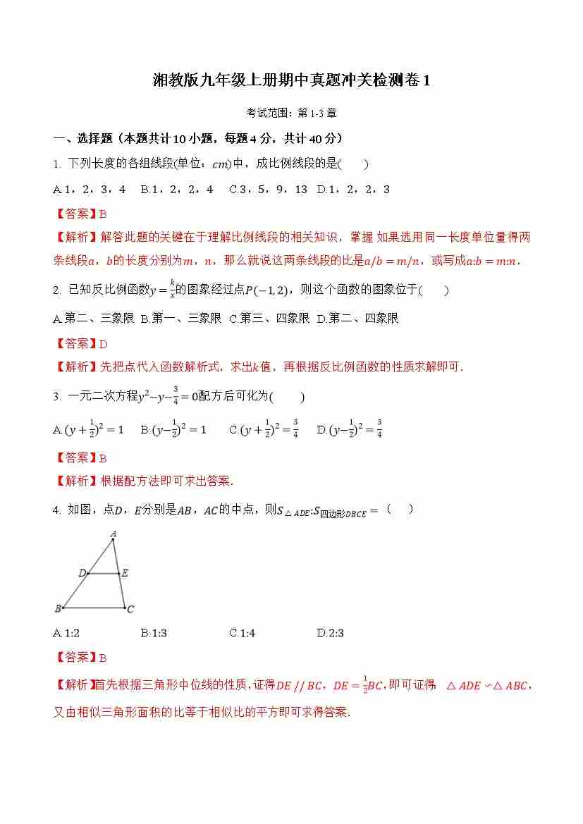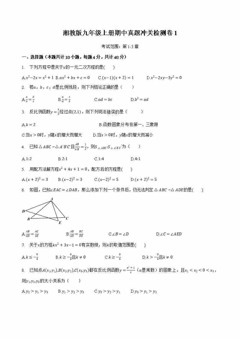 九上数学:【湘教】期中模拟卷01【范围:1-3章】