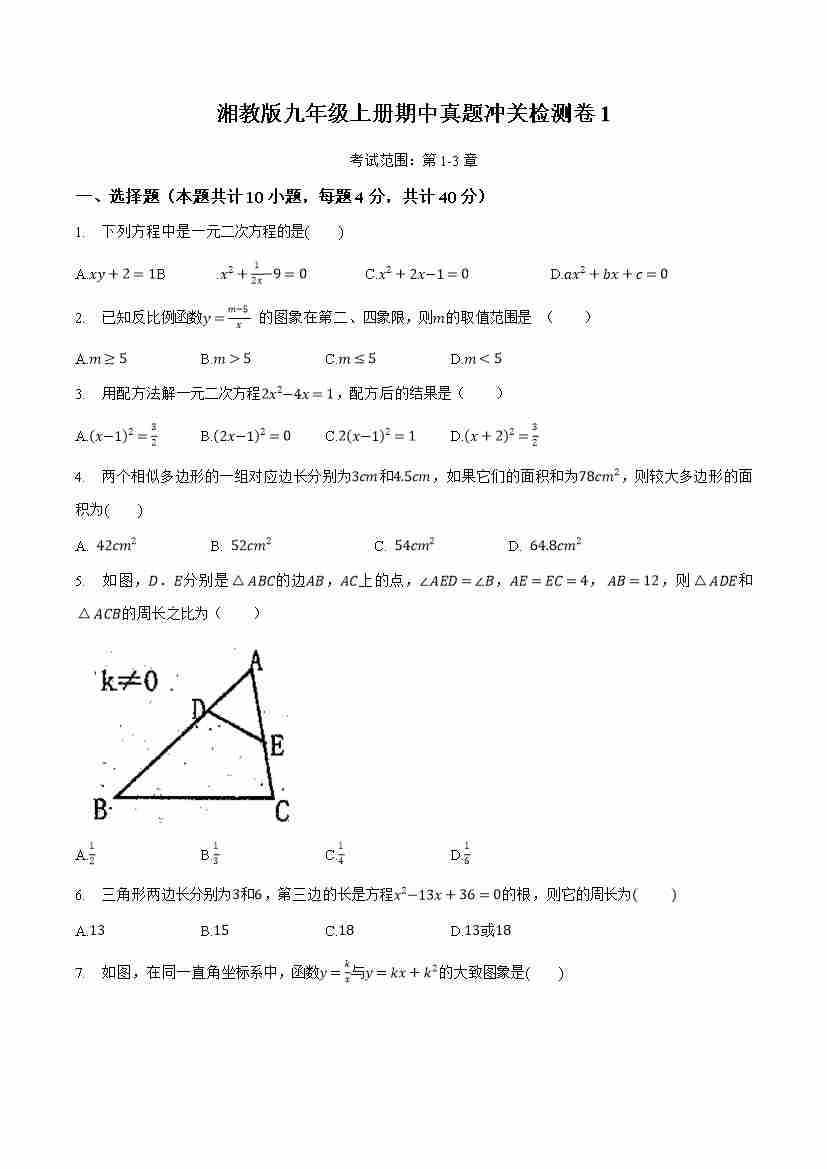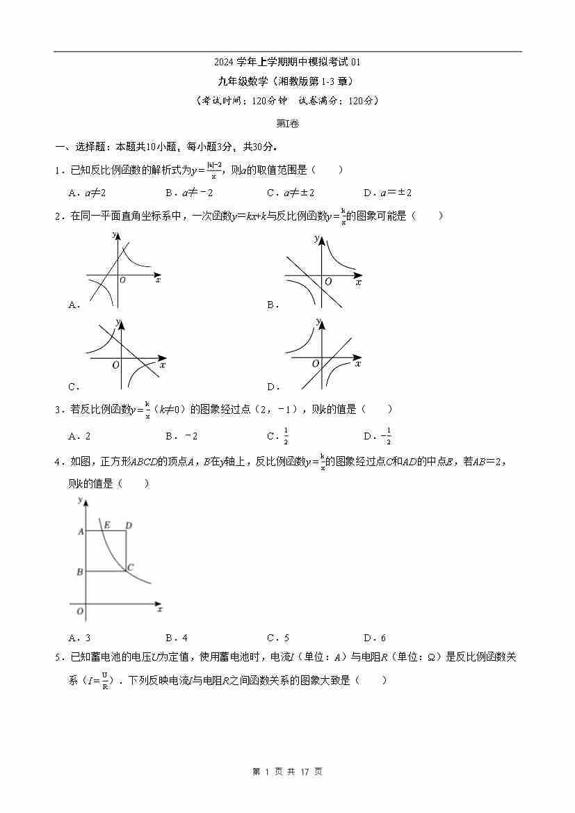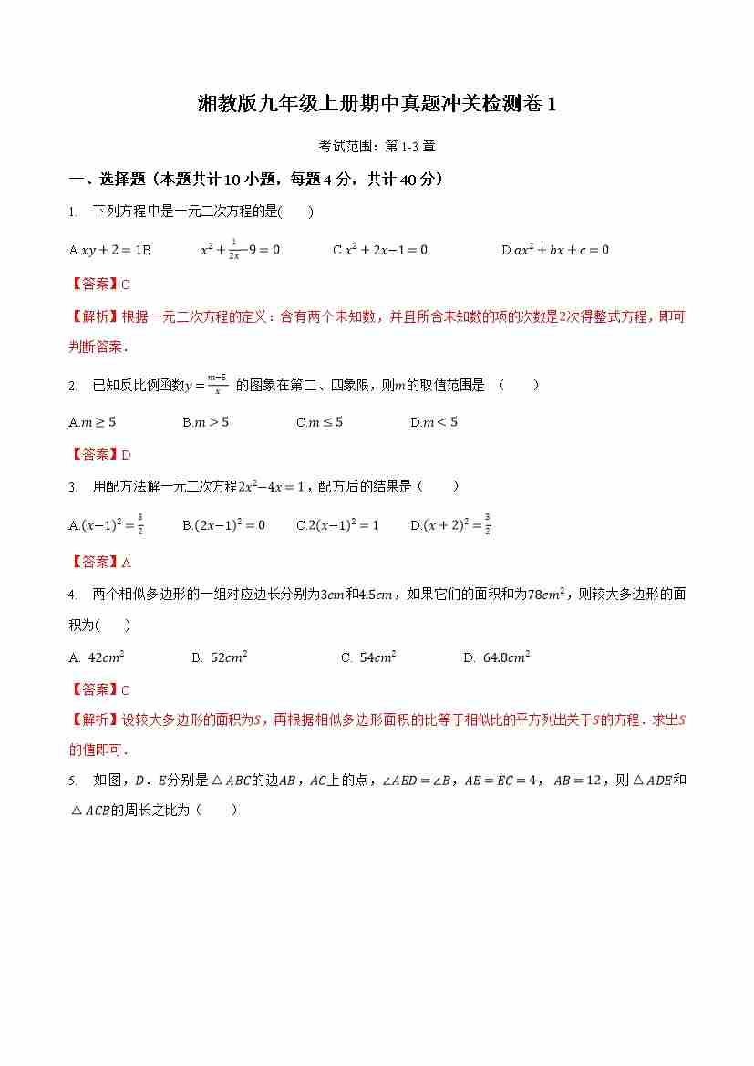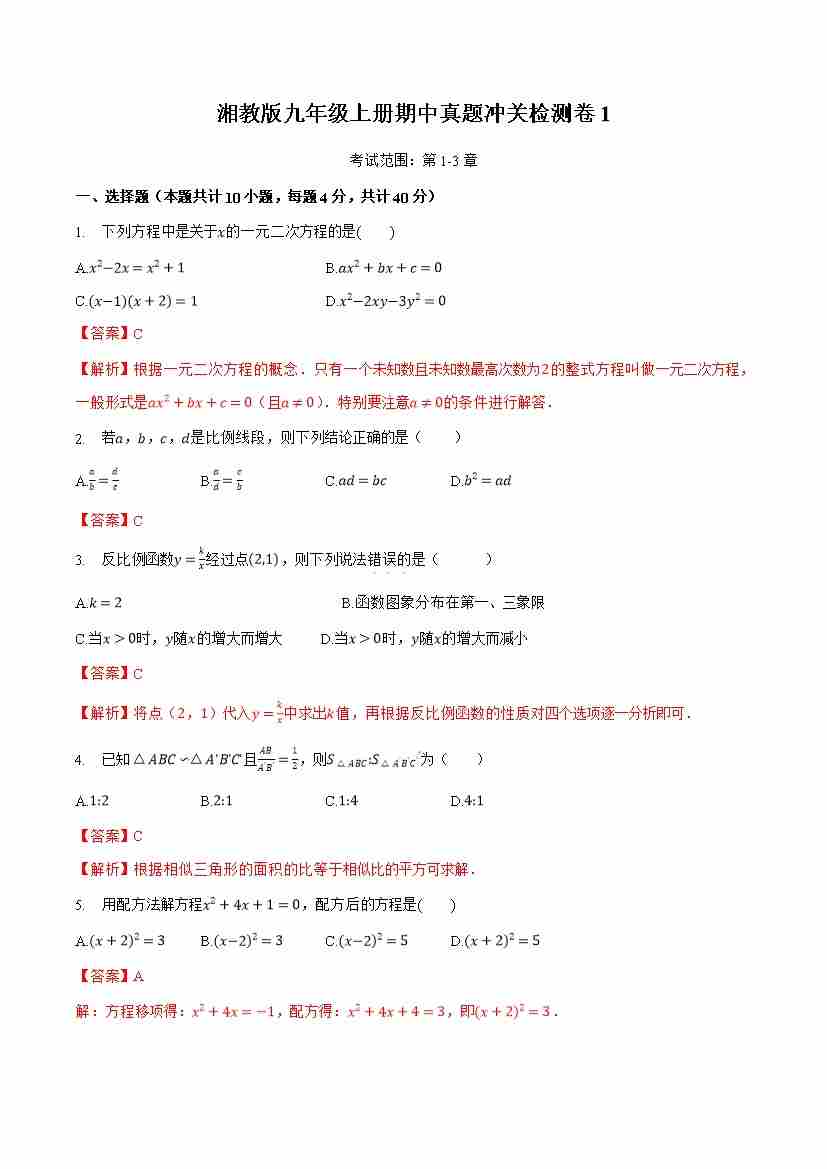 九上数学:【湘教】期中模拟卷01【范围:1-3章】