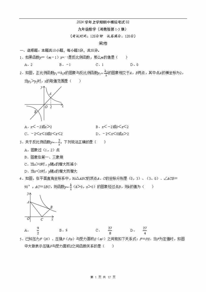 九上数学:【湘教】期中模拟卷02【范围:1-3章】