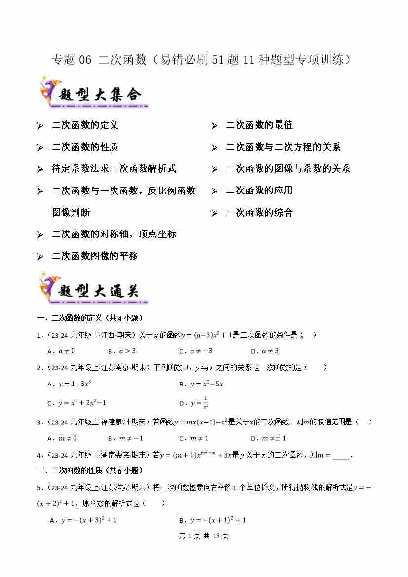 专题06 二次函数(易错必刷51题11种题型专项训练)(原卷版)