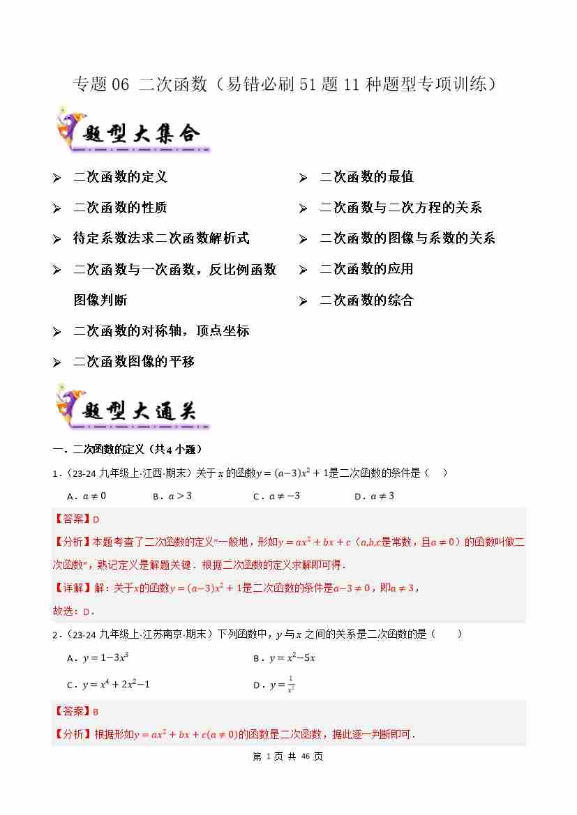 专题06 二次函数(易错必刷51题11种题型专项训练)(解析版)
