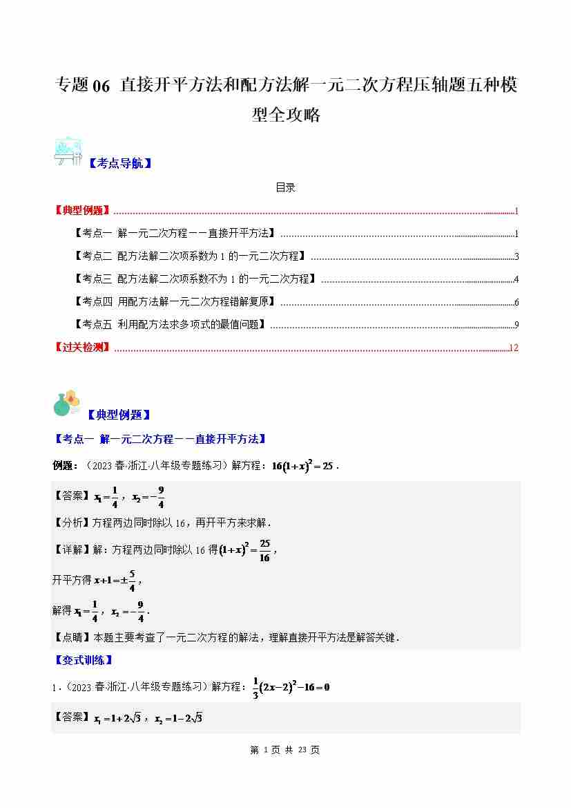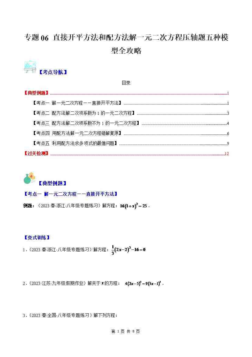 专题06 直接开平方法和配方法解一元二次方程压轴题五种模型全攻略(原卷版)