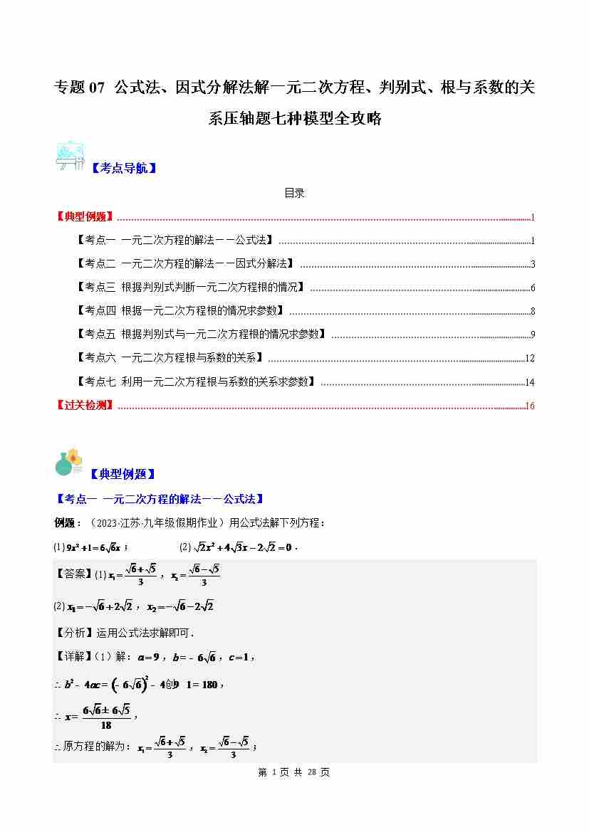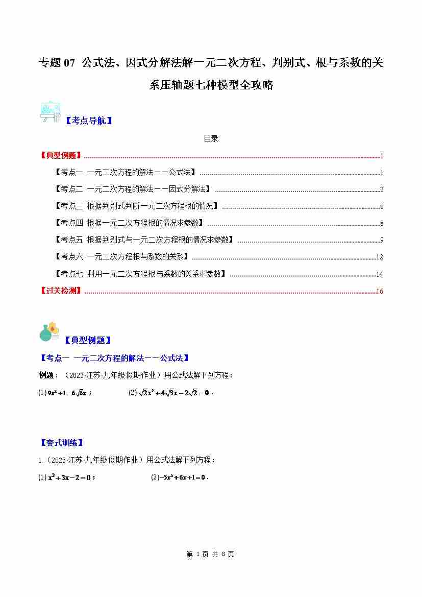 专题07 公式法、因式分解法解一元二次方程、判别式、根与系数的关系压轴题七种模型全攻略(原卷版)