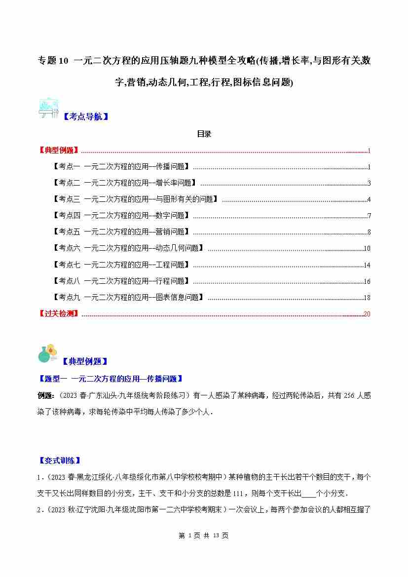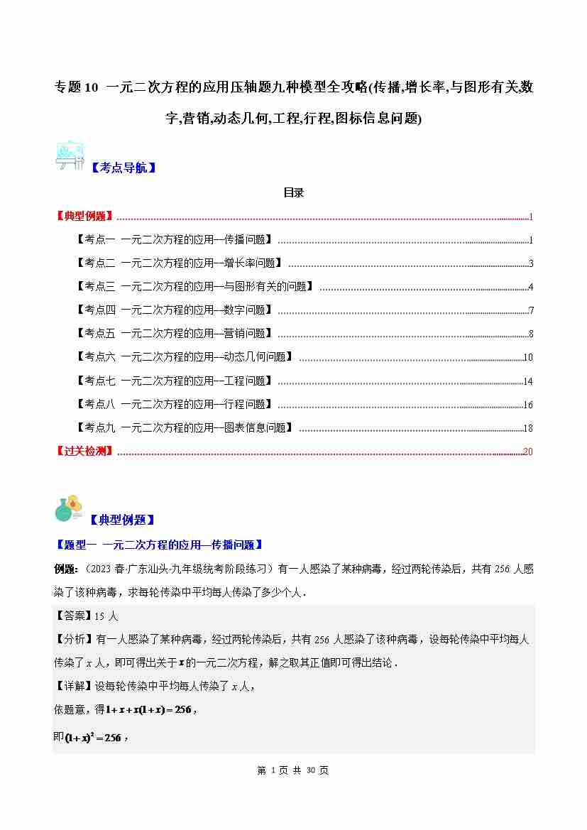 专题10 一元二次方程的应用压轴题九种模型全攻略(传播,增长率,与图形有关,数字,营销,动态几何,工程,行程,图标信息问题)(原卷版)