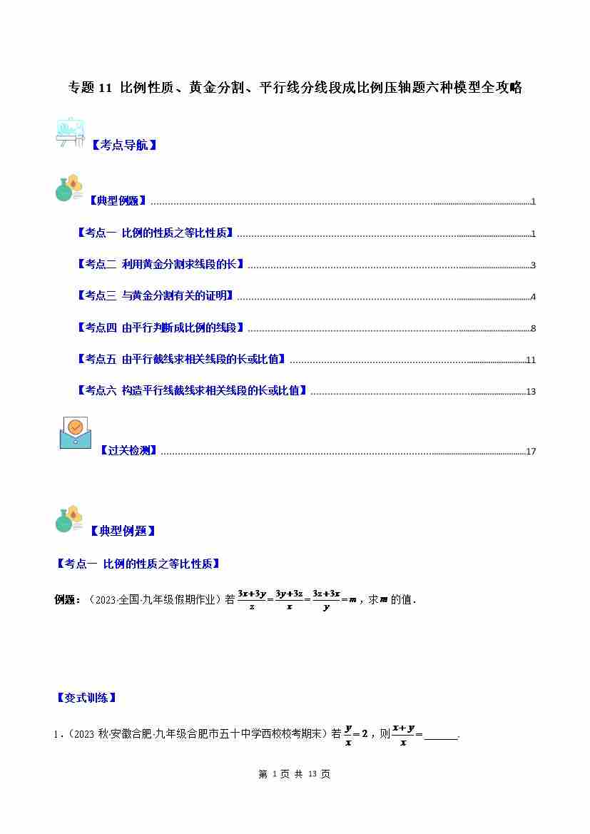 专题11 比例性质、黄金分割、平行线分线段成比例压轴题六种模型全攻略(原卷版)