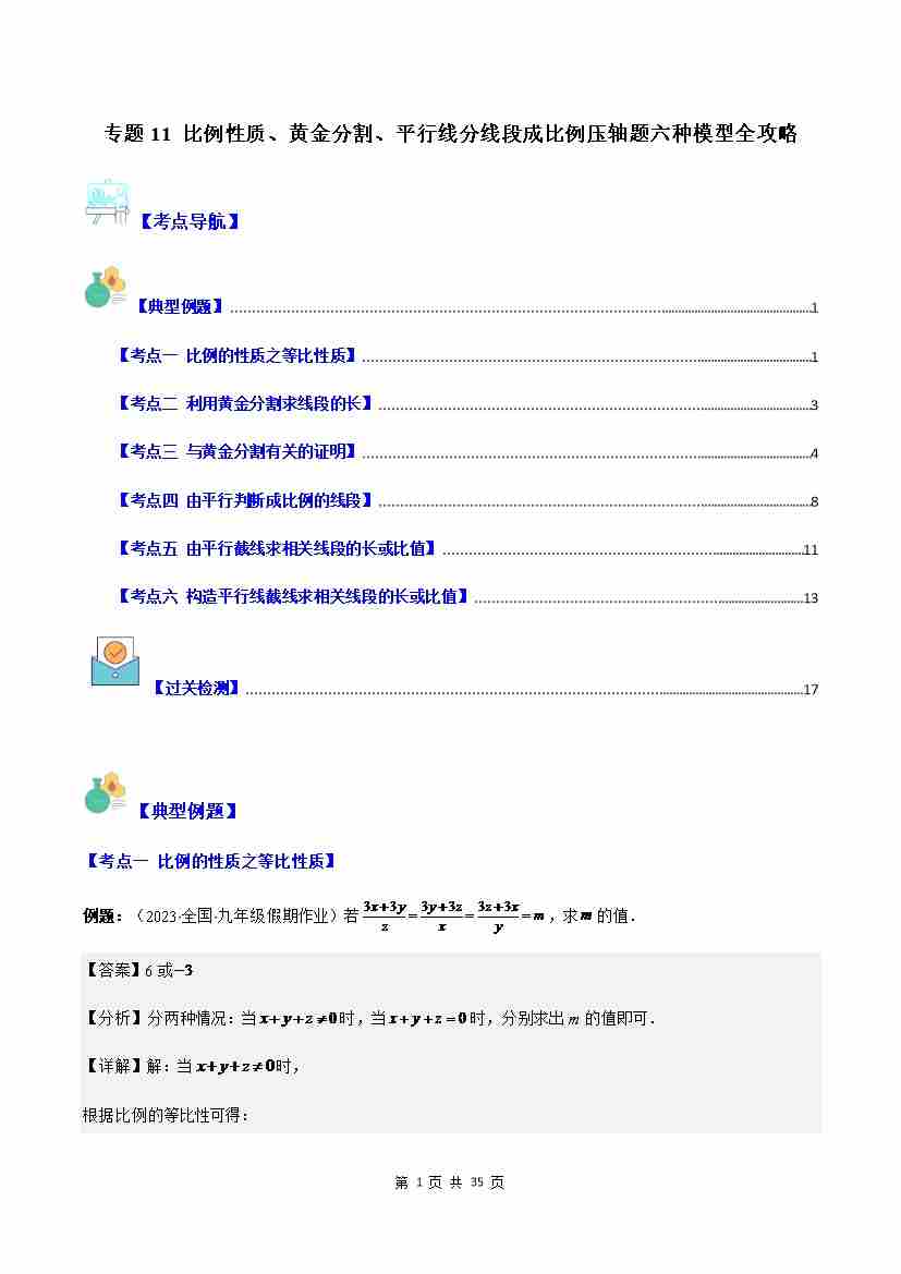 专题11 比例性质、黄金分割、平行线分线段成比例压轴题六种模型全攻略(解析版)