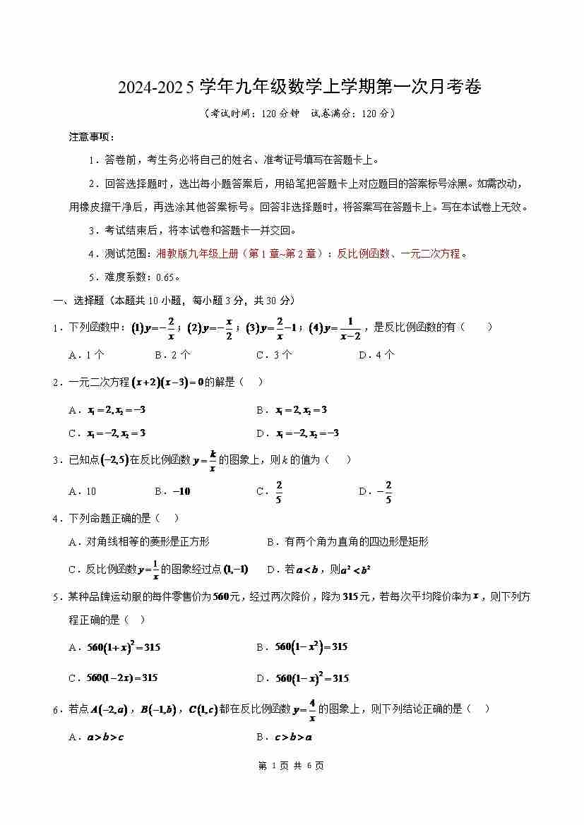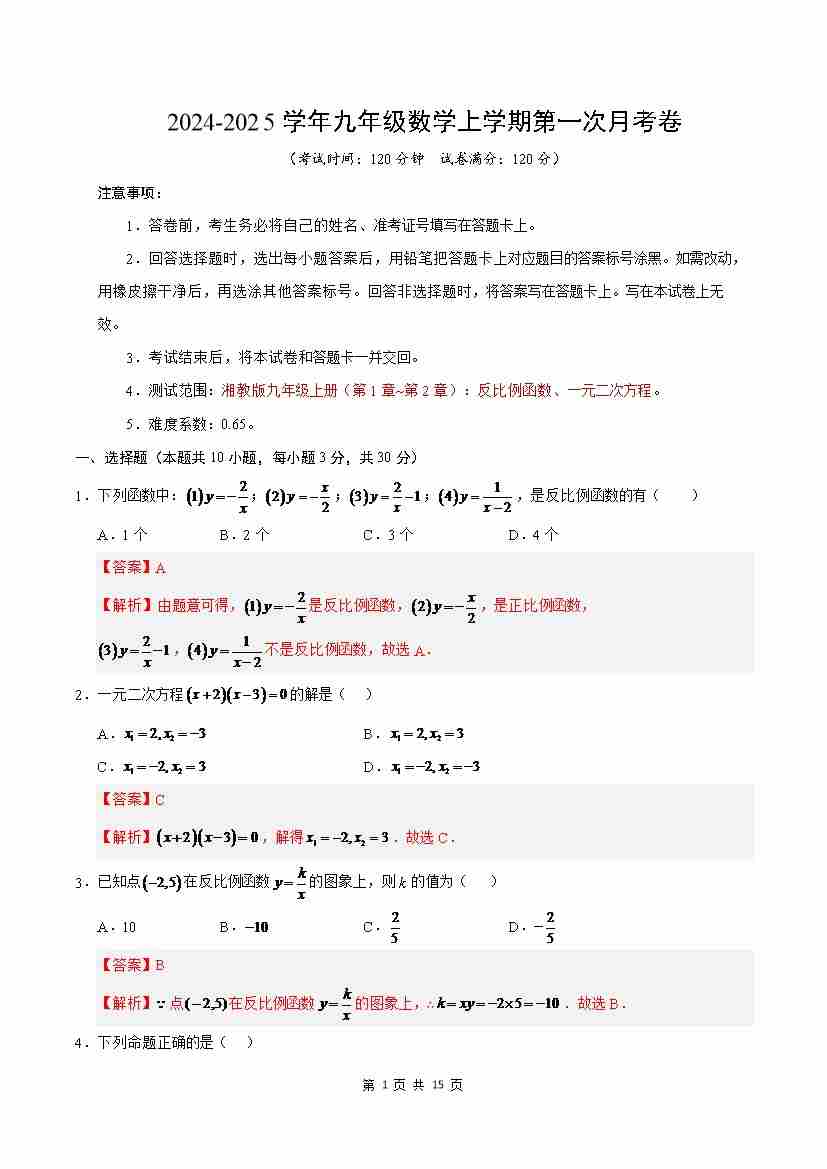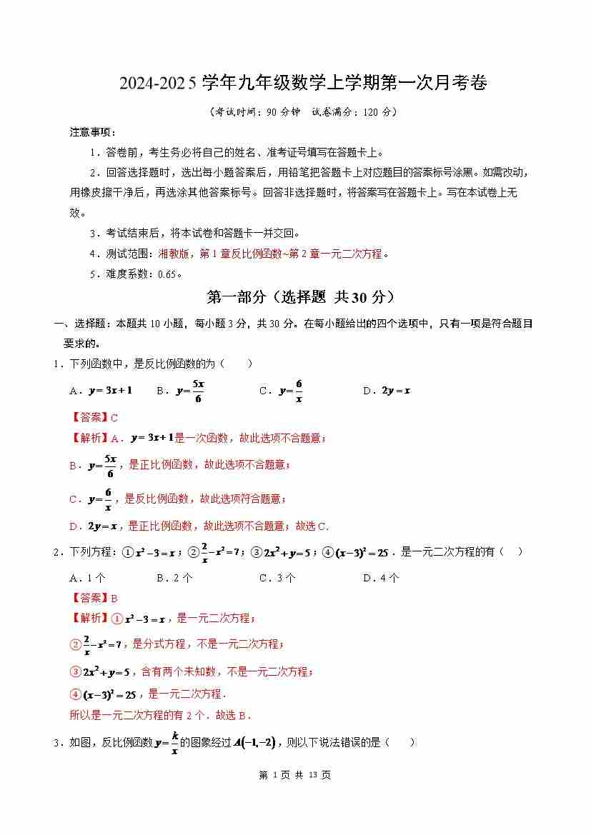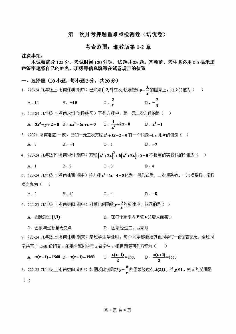 第一次月考卷(考试版A4)【测试范围:湘教版九年级上册反比例函数、一元二次方程】--