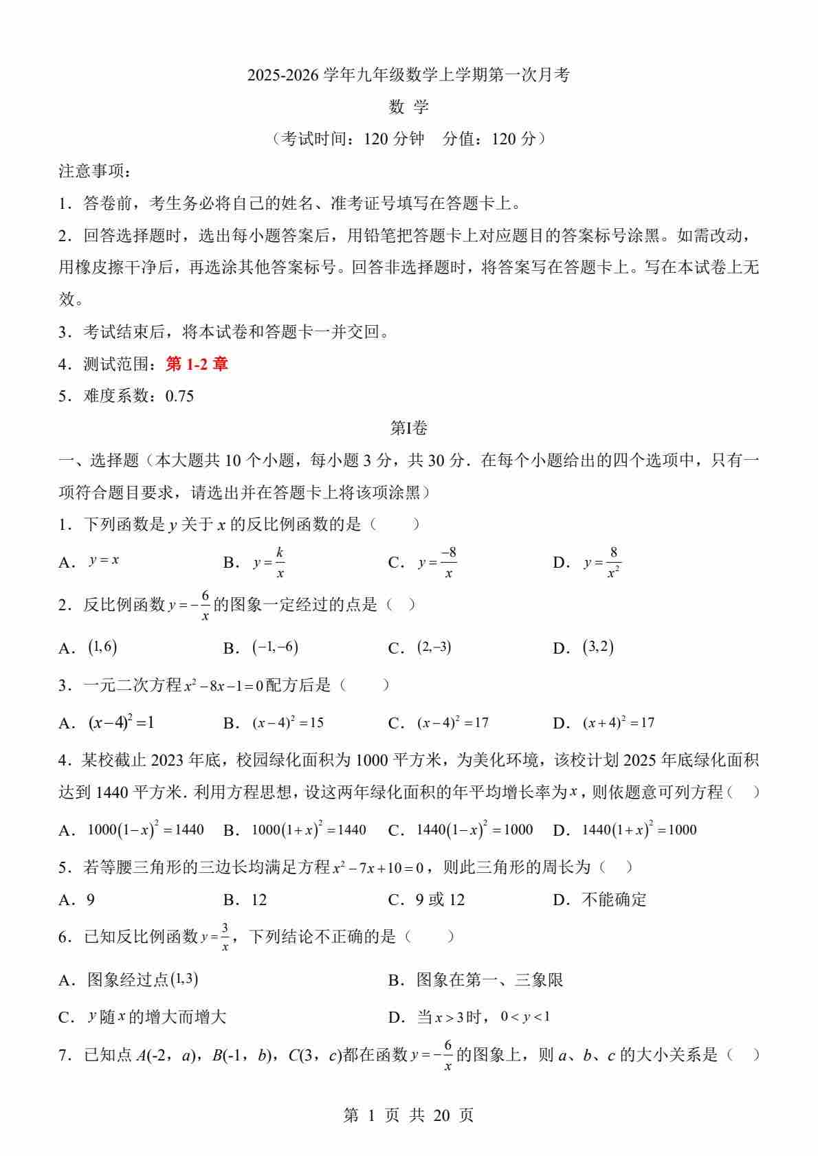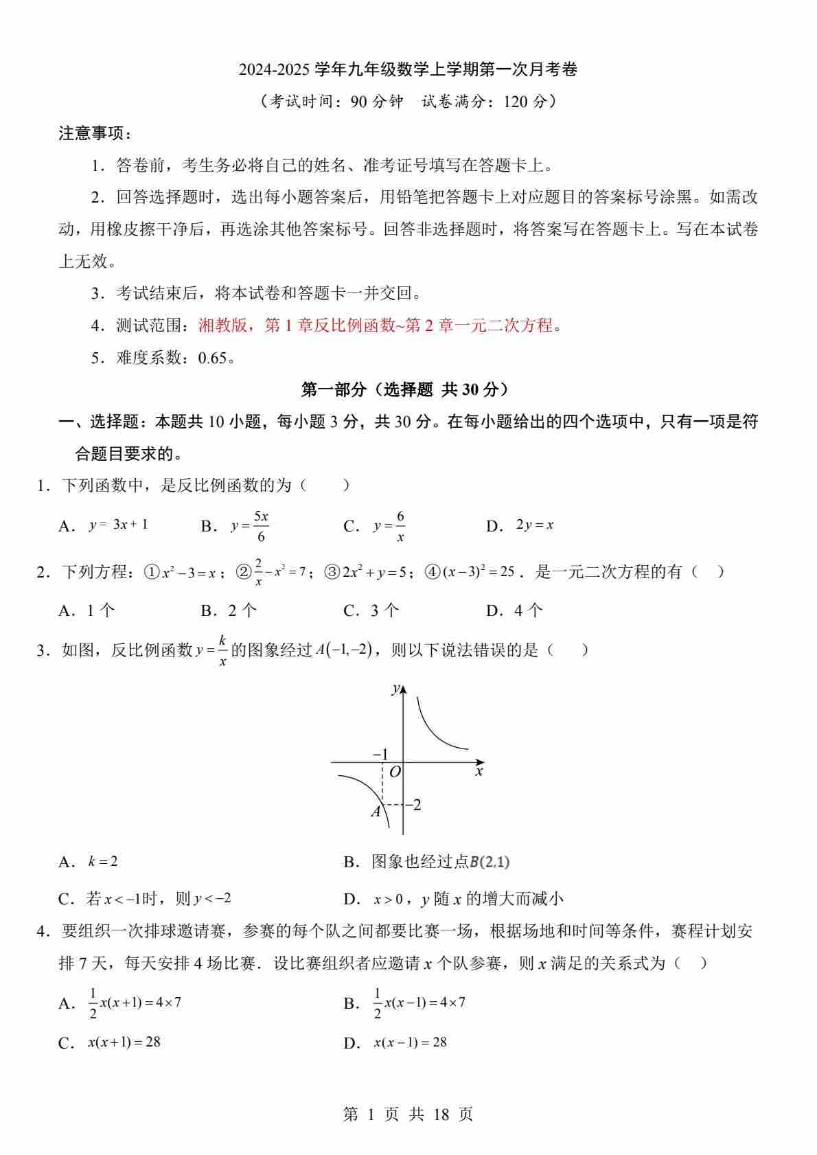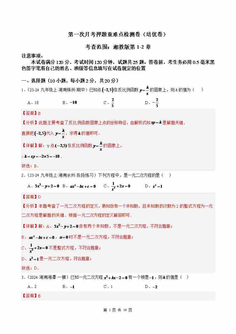 第一次月考卷(考试版A4)【测试范围:湘教版九年级上册反比例函数、一元二次方程】--