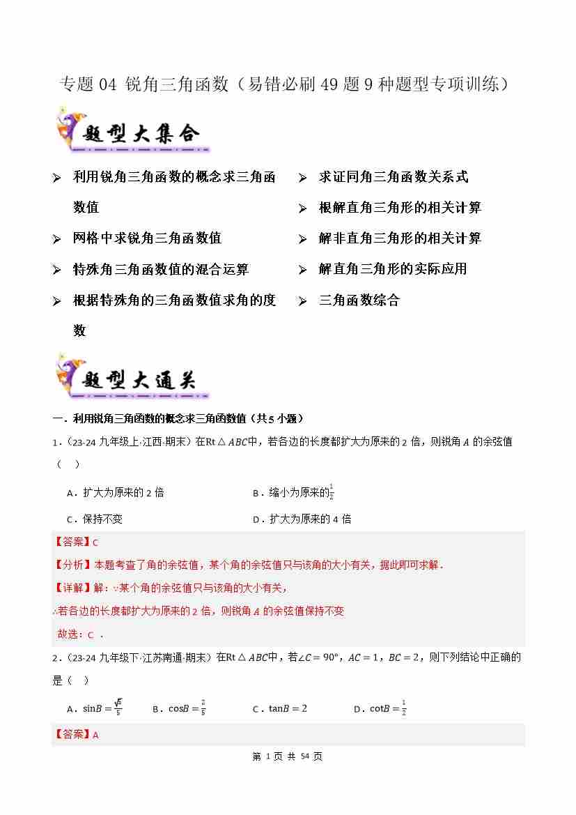 专题04 锐角三角函数(考题猜想,易错必刷49题9种题型)(解析版)