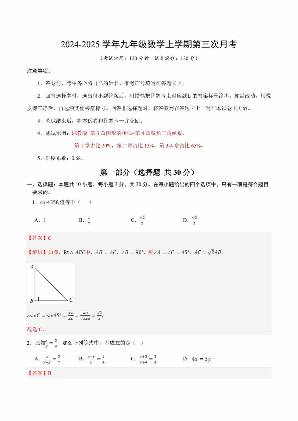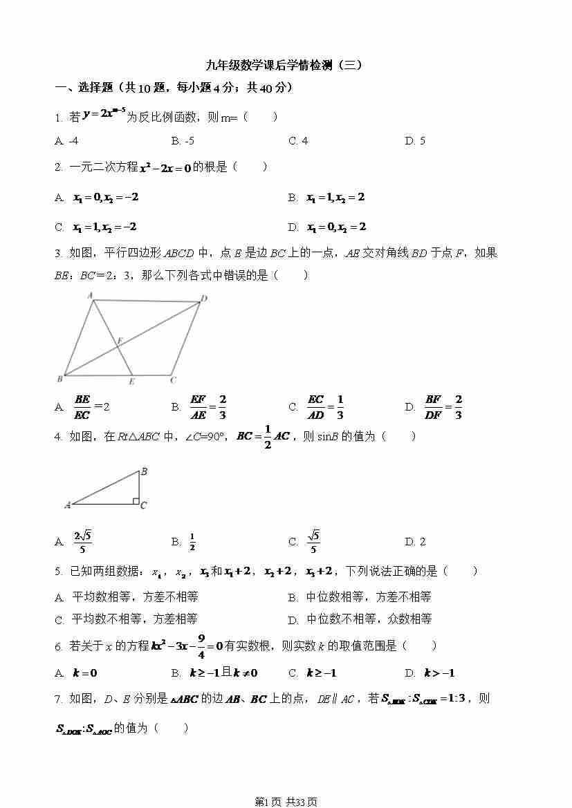 【湘教】9上数学第1次月考【第1-2章】