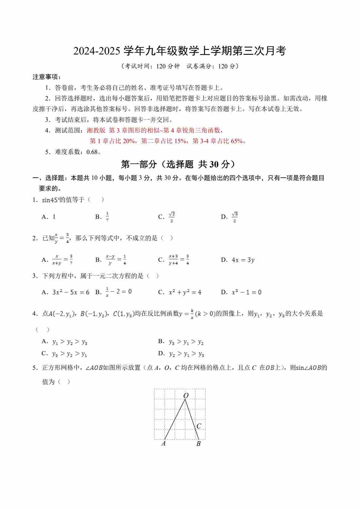 九年级数学第三次月考卷【测试范围:第3章~第4章】(考试版A4)