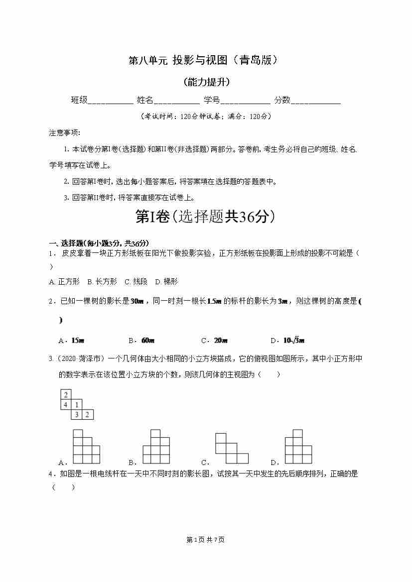 第8单元 投影与视图(能力提升)(原卷版)