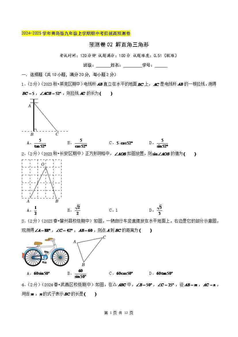 预测卷02 解直角三角形(原卷版)--
