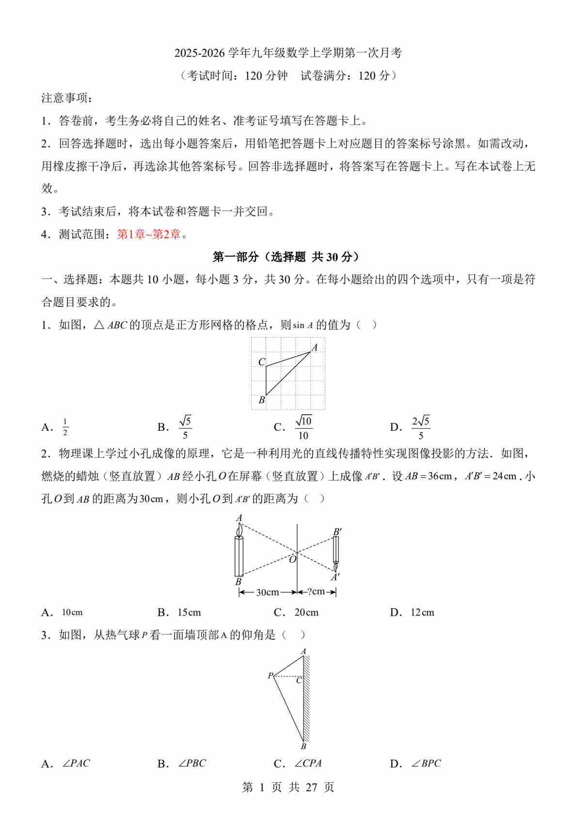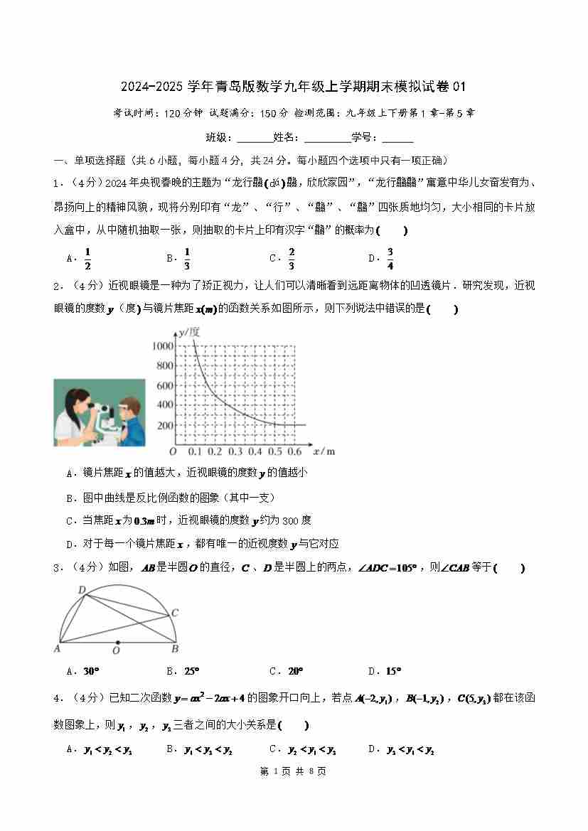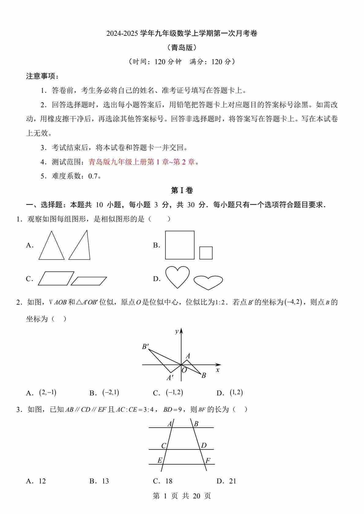 【青岛】9上数学第1次月考【第1-2章】2024-2025