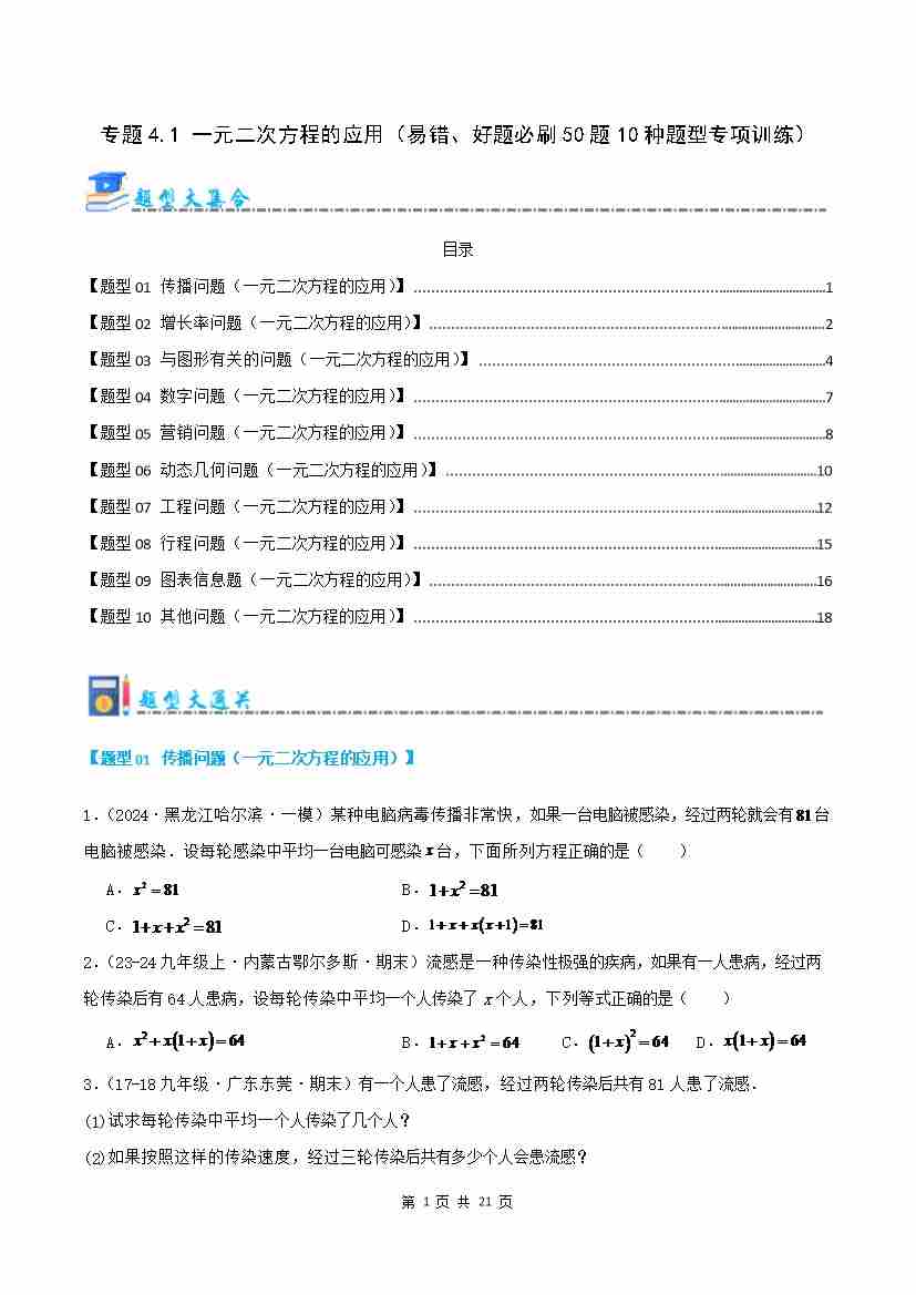 专题4.1 一元二次方程的应用(易错、好题必刷50题10种题型专项训练)(原卷版)