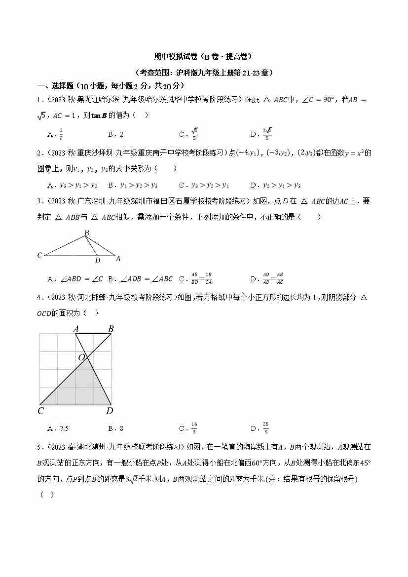 九上数学:【沪科】期中模拟卷B【范围:21-23章】