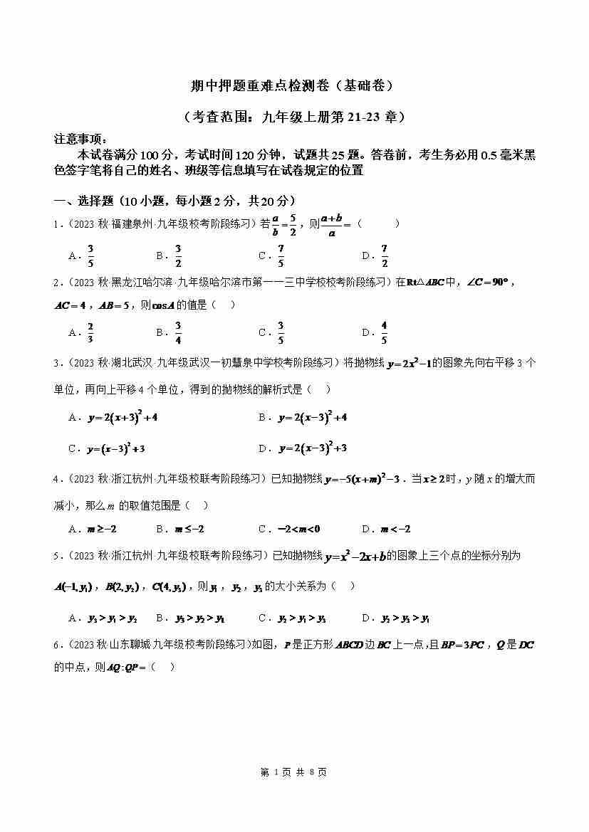 期中押题重难点检测卷(基础卷)(考试范围:第21-23章)(原卷版)