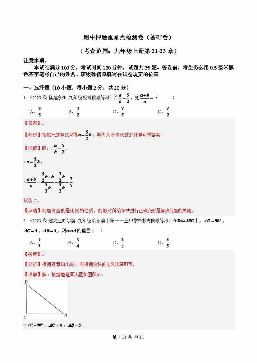 期中押题重难点检测卷(基础卷)(考试范围:第21-23章)(解析版)