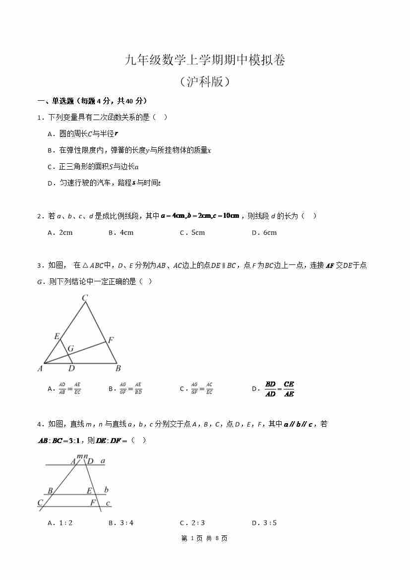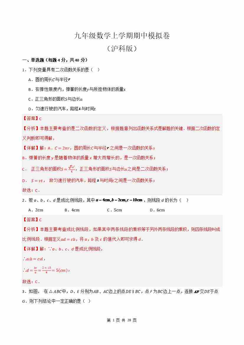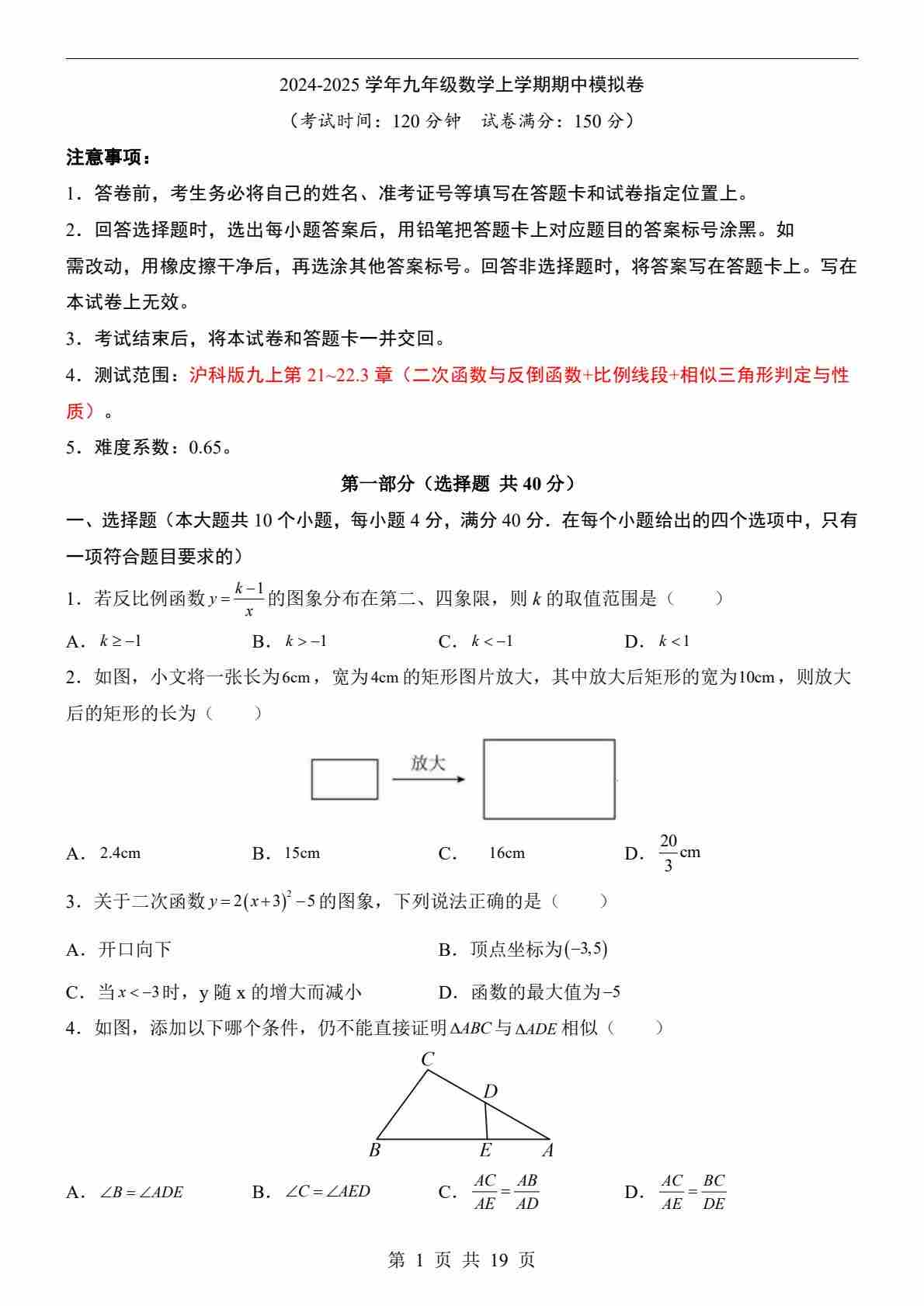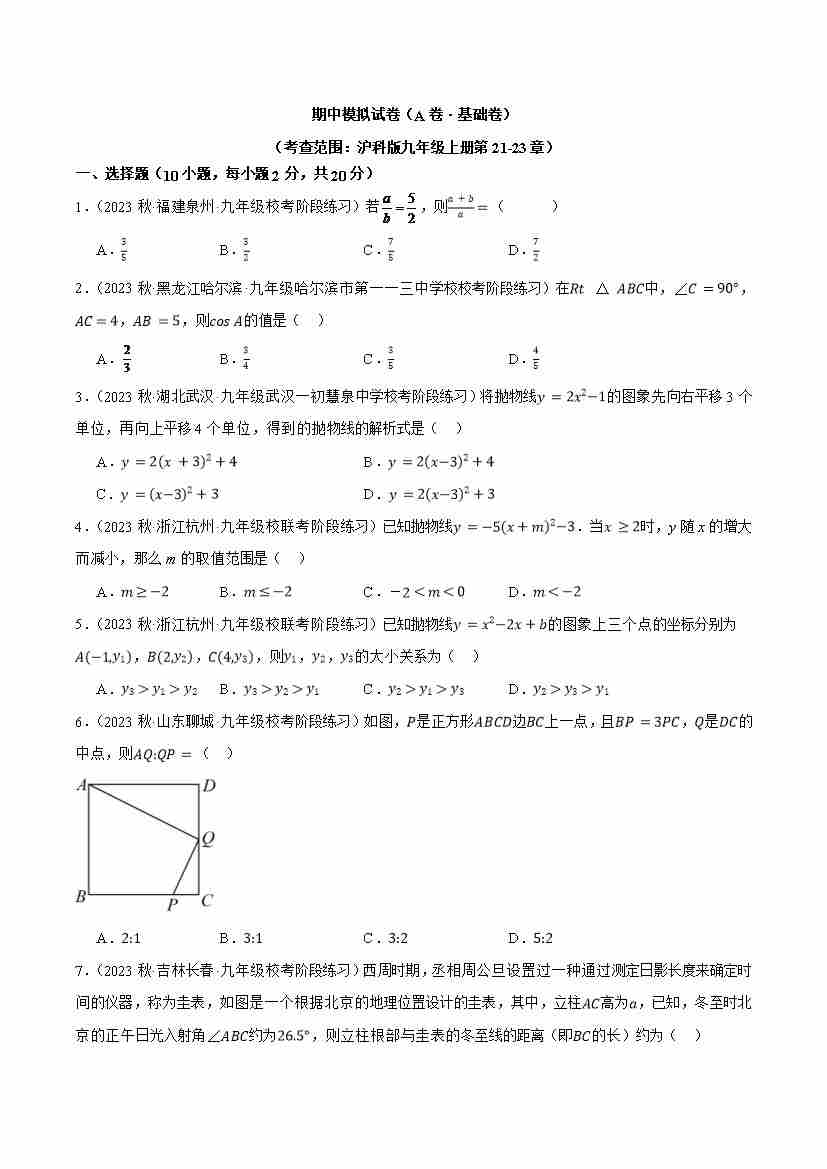 九上数学:【沪科】期中模拟卷A【范围:21-23章】