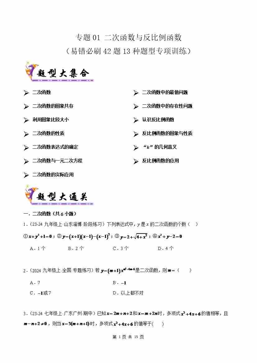 专题01 二次函数与反比例函数(考题猜想,易错必刷42题13种题型)(原卷版)