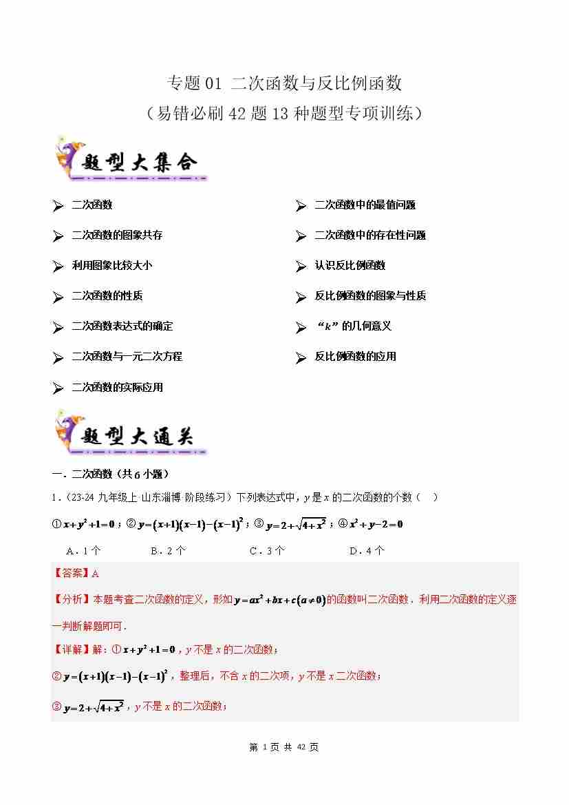 专题01 二次函数与反比例函数(考题猜想,易错必刷42题13种题型)(解析版)